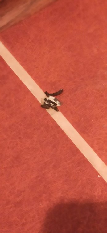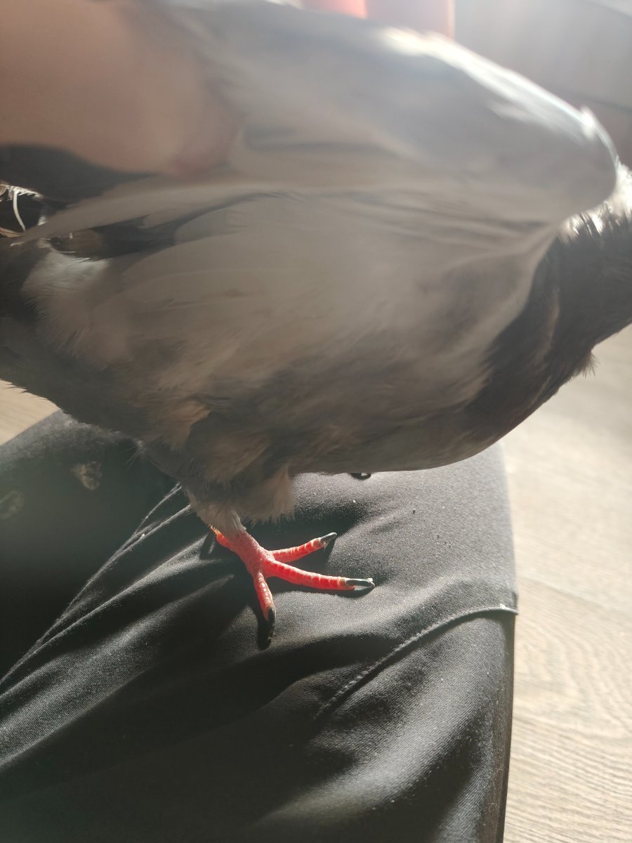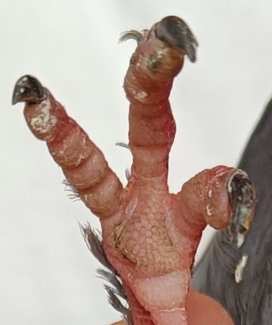 Кристаллов в помете я не наблюдаю. Прощупал ножки. На неработающей правой лапе хорошо прощупывается крупный сустав у корпуса, который я обвел красным кружком на рисунке. Я могу просунуть палец между корпусом птицы и этим суставом. В то время как на здоровой лапе я поначалу этот сустав не мог даже найти (вчера щупал утром и вечером - и не нашел), словно он утоплен в корпус и прикрыт мышцами. Т.е. на неработающей лапе этот сустав как бы немного отходит от корпуса. Фото лапки прикрепляю. Посчитал количество дыханий у лежащей на полу птицы по вздыманию спинки - порядка 51-52 вдохов в минуту. Это нормально? Птица вроде бы стала есть 2 раза в день. Утром в районе 10-11 и вечером в районе 4-5. Вчера снова ее взвешивал утром после еды. Получилось где-то 334 грамма (она в это утро поела меньше чем обычно).