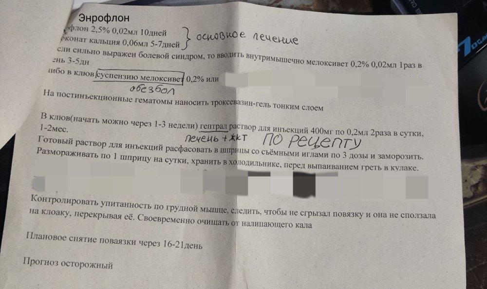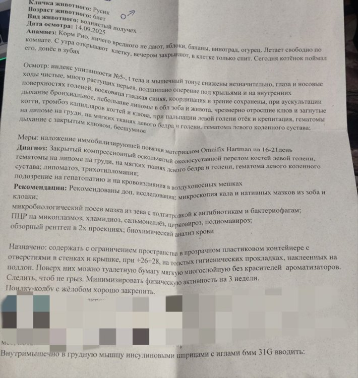 Общее описание: Мой попугай пережил укус кота без последствий полгода назад, пережил перелом лапы 3 месяца назад. При переломе отвезли за 1,5ч от нас в Балашиху, в Зелёный попугай, к сожалению, вышло только туда, тк средств на домашний вызов не было, а я в то время ещё не особо разбиралась в клиниках (да и сейчас тоже). По показаниям врача попугай отходил 3 недели с перевязанной лапой, всё обошлось, бегает и прыгает без хромоты, и сейчас ключевой момент, после основного лечения начали давать гептрал инъекционный в клювик. Скормила почти все шприцы по курсу, но сделала паузу и перестала давать последние штук 10 (из 30 примерно). По неудачному стечению обстоятельств, за что я сейчас себя ненавижу, меня домашние заставили спустя пару недель додавать те шприцы. На второй день от попугая начал исходить запах рыбы. Я перестала давать те шприцы уже как с 19 декабря, а от него и от его помёта до сих пор исходит этот запах. Я не понимаю, трихомоноз это или ещё что, денег вообще нет, а куда-то ехать с ним ещё и без переноски, в метель и большой минус я боюсь. Анкета: 1. Вид - получех. 2. Возраст, пол и вес - 6 лет, самец, 47гр 3. Рацион - корм Рио, для линьки и обычный, минеральная смесь Рио 1/4 к корму, одна ветка сенегальского просо Рио раз в одну-две недели. Ничего запрещённого не разрешаю, очень любит бананы, яблоки, другие разрешённые фрукты и овощи в разумных количествах. 4. Условия содержания птицы - температура в комнате в основном 20-23 градуса, но у меня периодически включён обогреватель, поэтому от 24. У попугая над клеткой всегда включена электрическая грелка, без неё ему очень плохо после перелома и он совсем не двигается в случае отключения. Клетка открыта весь день, закрываем вечером, когда сам заходит и готовится ко сну, время по-разному, но примерно с 12 до 23, ориентируюсь на него и его состояние. 5. Настораживающие симптомы, как долго болеет - Первое: постоянно трясётся, в основном тряска крыльями, от чего и при каких обстоятельствах так и не поняла, предполагаю, что по независящим причинам, так же, уточню, это началось после перелома. Второе: запах рыбы из клювика и от помёта. Не гнилостный, а именно рыбный, как крабовые палочки или шпроты. Началось после повторной дачи гептрала. Выпирающего зоба, вроде, нет. Третье: 3 и 4 фото, новообразования внутри стенок подклювья, с обеих сторон, размер отличается. Когда появилось, точно не скажу, увидела вчера при осмотре и сильно расстроилась. Даже не знаю как называется и что это, очень надеюсь на помощь знающих. Четвертое: общее удовлетворительное состояние попугая. на сегодняшний момент он не бесконечно вялый, летает, активный, выполняет команды, выглядит обычно. Рвоты никогда не было, про понос затрудняюсь ответить, но бывает испражняется желто-белой или светло-зелёной жидкостью без самого помёта. Пятое: 5-7 фото, он уже давно липомный мальчик почти как два года, раньше была одна штучка на грудке, Сейчас две самые большие на грудке и над клоакой, так же есть мелкие, как я предполагаю, по всему телу. видела несколько на крыльях и на спинке. В корм добавляю раздавленную таблетку расторопши в рекомендованной дозировке. Шестое: чуть больше полугода назад начались эпизоды очень странной линьки, выпадали маховые перья и он не мог банально летать. За это время так было уже 2 раза. Седьмое: примерно уже 1,5 недели странно иногда чавкает и хрюк