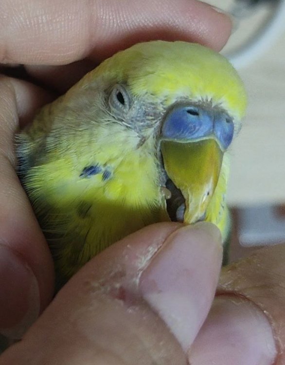 Попугай волнистый, 2-3 года Обнаружили данную дырку сегодня, сам попугай активный, но такое чувство, как будто ему больно. Так же есть самка, с ней такого дефекта на клюве нету.