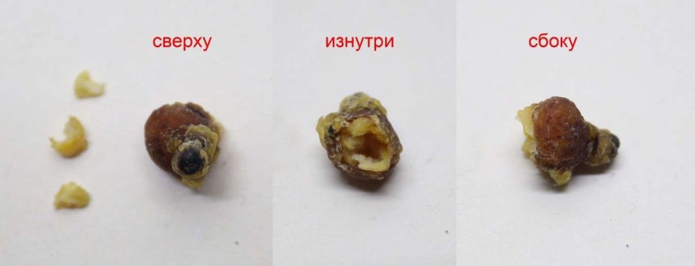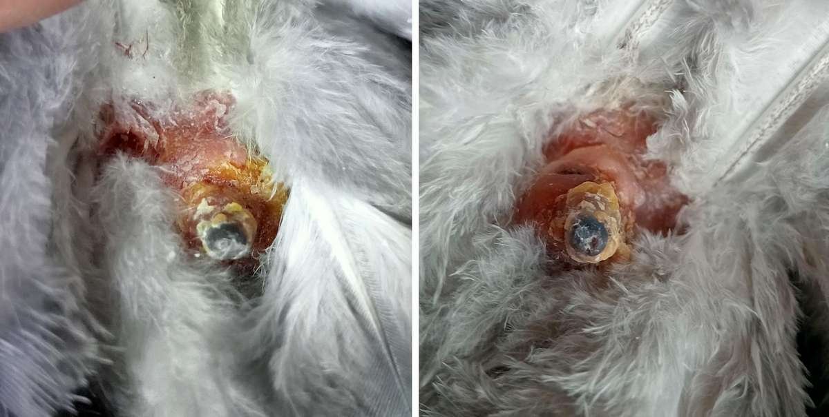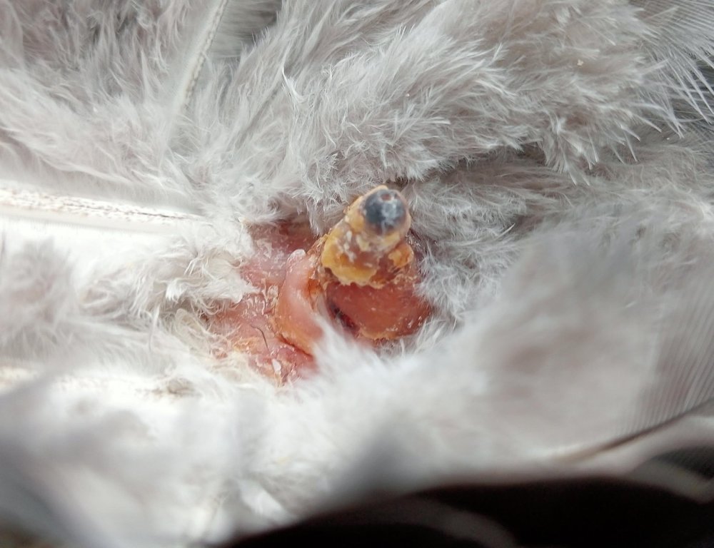 Нарост на гузке 3 дня обрабатывали Хлоргексидином. Он еще увеличился (на парном фото 1 как было/стало). Попробовали снять с боку, как получилось (фото 2). Нарост решили пошевелить, покачать. Потянули и он оторвался. Выступило немного крови. Часть нароста осталась внутри. Подковырнули и из раны вышло несколько осколков. Сфотографировали с разных сторон. То, что я считала твердой гузкой, покрытой коркой - оказалось наростом. Его размеры: длина без учета обломившихся осколков - 12 мм, диаметр 10 мм. Первоначально из гузки торчало длиной 5 мм и диаметром 4 мм. Предполагаю одной из причин стало приближение гули к ожирению. По килю он между нормой и ожирением. Зотя вес всего 300 грамм что меня и смутило. Думала - при таком весе какое там ожирение? И еще для вхождения в зиму думала лишняя упитанность не повредит... Решила убрать из питания бобовые - горох и чечевицу. Уменьшу долю пшеницы, увеличу ячмень. Там посмотрим. Буду наблюдать и еще пару дней продолжу Хлоргексидин. -