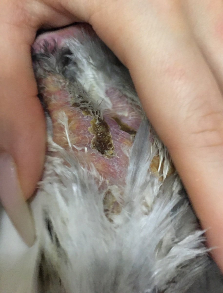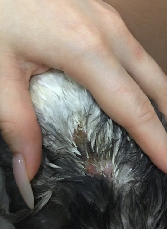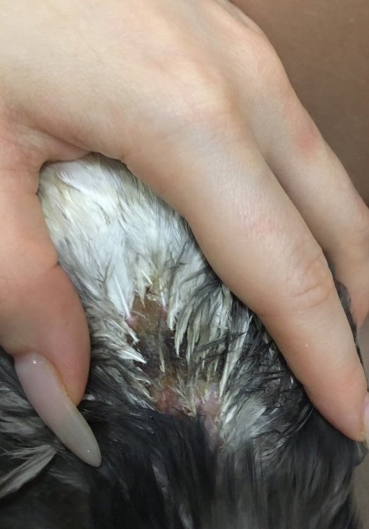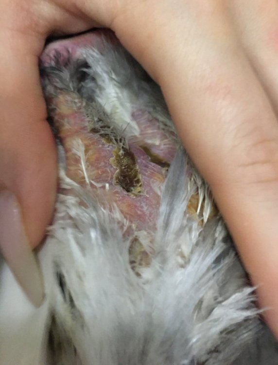 Добрый день. Помогите пожалуйста. Волнистик 7 лет , мальчик. Мама недавно нашла на газете капельку крови, осмотрела птицу ничего не нашла. Прошло где-то недели две, попугай взъерошился и мама увидела у него опухолть на спине около хвоста. Попугайчик активный, кушает хорошо . Вроде как нам сказали это копчиковая железа во спалилась,на фото есть препараты чем обработать.Мы убрали корочки, появилась дырочка. Обработали мазью с антибиотиком и диоксидином с новокаином. Сейчас уже лучше, но все равно красное и плохо заживает. В ветклинике узнали цены на осмотр попика, мы в шоке.... Что это может быть и что можно сделать, помогите подскажите пожалуйста На первом фото то что было, неровная шишка с буграми и сукровицой, сейчас просто воспаление. Перья все на месте, просто жирные от мази.