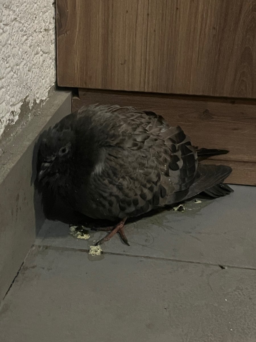 Доброго дня всем! Залетел на балкон голубь, дышит часто, чуть походил и сел в угол, в темноте. Утром надеюсь, что смогу отвезти его в птичий шелтер (уже отвозила туда ворону), но может сейчас сможете дать какие-то советы. Перед тем, как посадить в коробку, включили свет в комнате и он перешел сам в темное место. Посадила его в коробку, положила воду в отрезанной бутылке и положила чуть риса, дно простелила бумажными полотенцами плотно, когда клала в коробку активно вырывался, крылья работают, пытался улететь и убежать. Огромное спасибо! Прилагаю фото ещё без коробки.