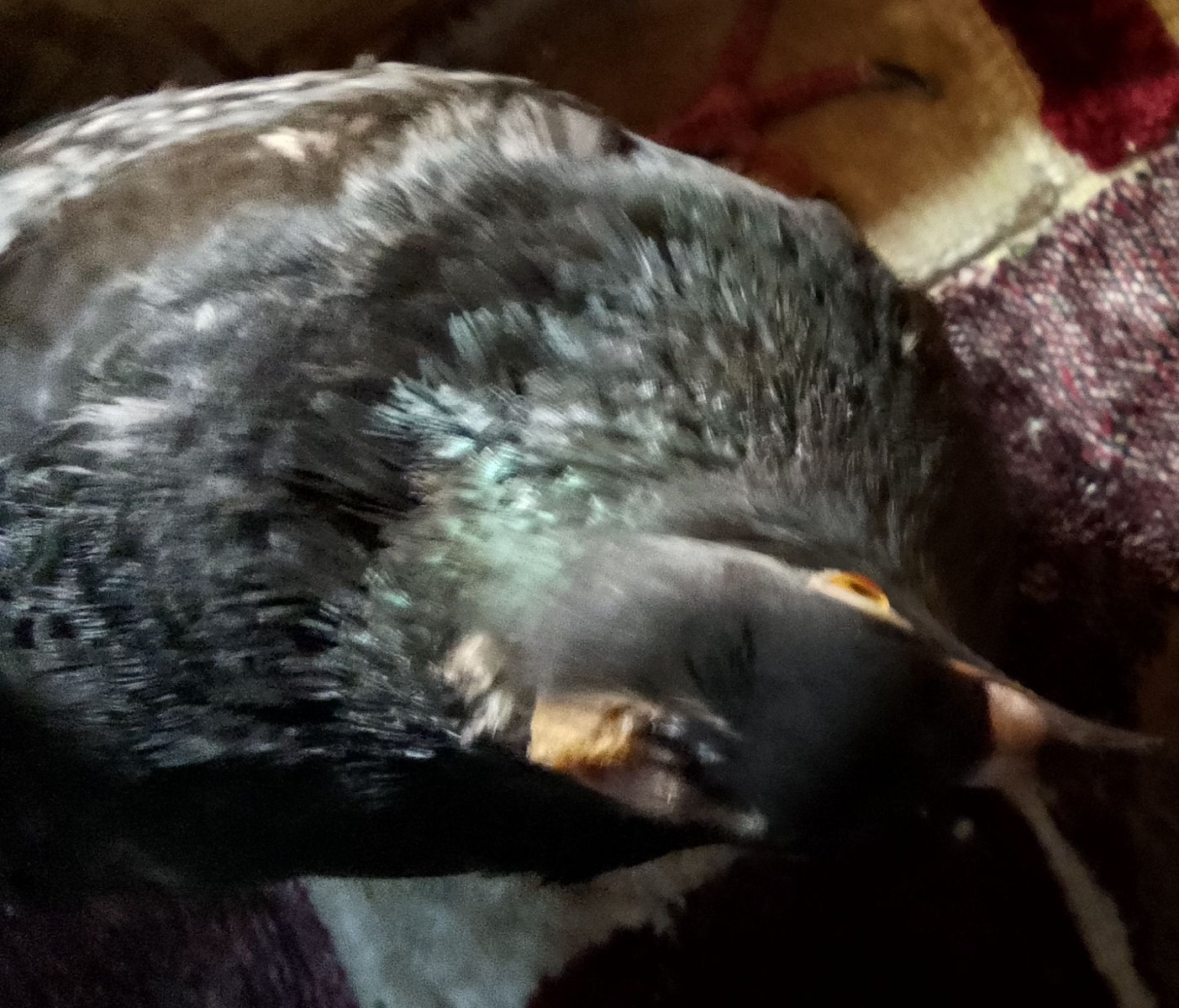 Здравствуйте, нашли голубя на улице , показалось, что он немного странно себя ведет, спит не в укром месте , как то вперёд заваливается. При осмотре обнаружили кровь в клюве, немного на перьях и рядом на земле пятно крови, из глаз текли слёзы, глаза закрываются постоянно. Положили его в коробку , дали воды , чуть отпил и вроде бы засыпает , но голова заваливается вперёд , он оперся о стенку коробки , сейчас он в тепле , тёмное место , но ему стало хуже , глаза не открывает , сильно вперёд завалился , он находится на работе , оставлять на ночь его тут не разрешат . Я думаю Голубь вращался куда то и у него черепно мозговая травма , есть ли возможность помочь птице