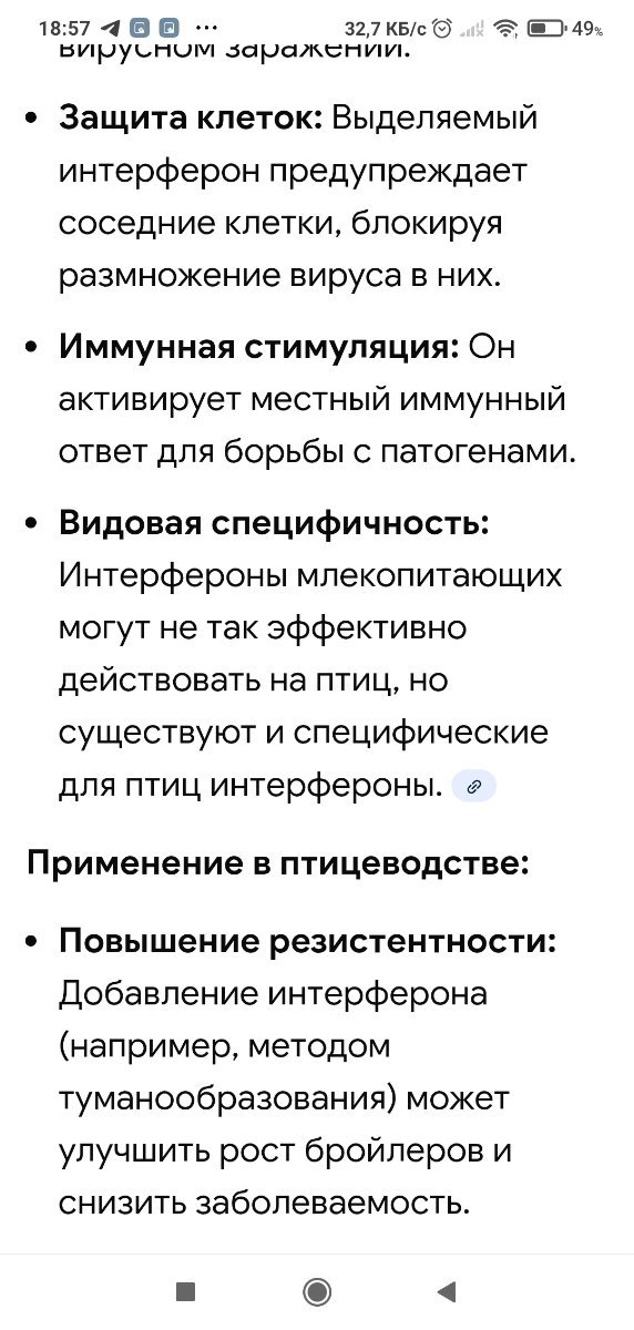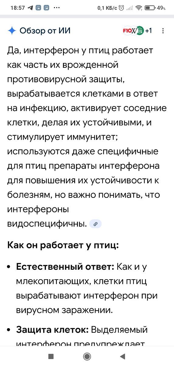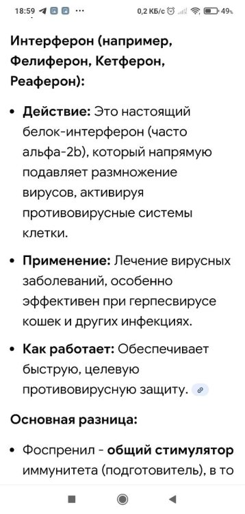 @Kir777 была тема не так давно, когда при подозрении на НК (анализов не было, по симптомам, в т. ч. у других птиц и первых симптомах у этой птицы) начали давать фоспренил и витамины. Что то ещё вроде давали, не помню, надо искать. Голубь выжил. Насчёт интерферонов, они видоспецифичны, рулетка, попадёт не попадёт. Фоспренил активирует собственные защитные силы организма, в том числе выработку собственного интерферона.