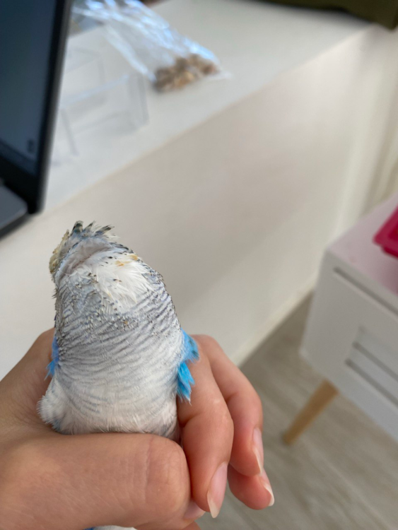 Вы в Греции. И это невесело. У меня есть пациенты в Греции, и там без рецепта фиг купишь (клиника доктора Теодороса Синаниса, знаю по ним).. Смочите шапочку птице, и отогните перо в противоположном росту направлении. Осмотрите кожу- нет ли там хлопьевидных объектов. Какого цвета очины перьев-нет ли внутри черного или бурого. Изменение оперения в зоне роста молодого пера может быть связано с паразитарным заболеванием типа очинного клеща поражением кожи малассезией Если бы было изменение цвета оперения на "лице"- тогда можно было бы говорить или просто об опачкивании кормом, или о рвоте. -