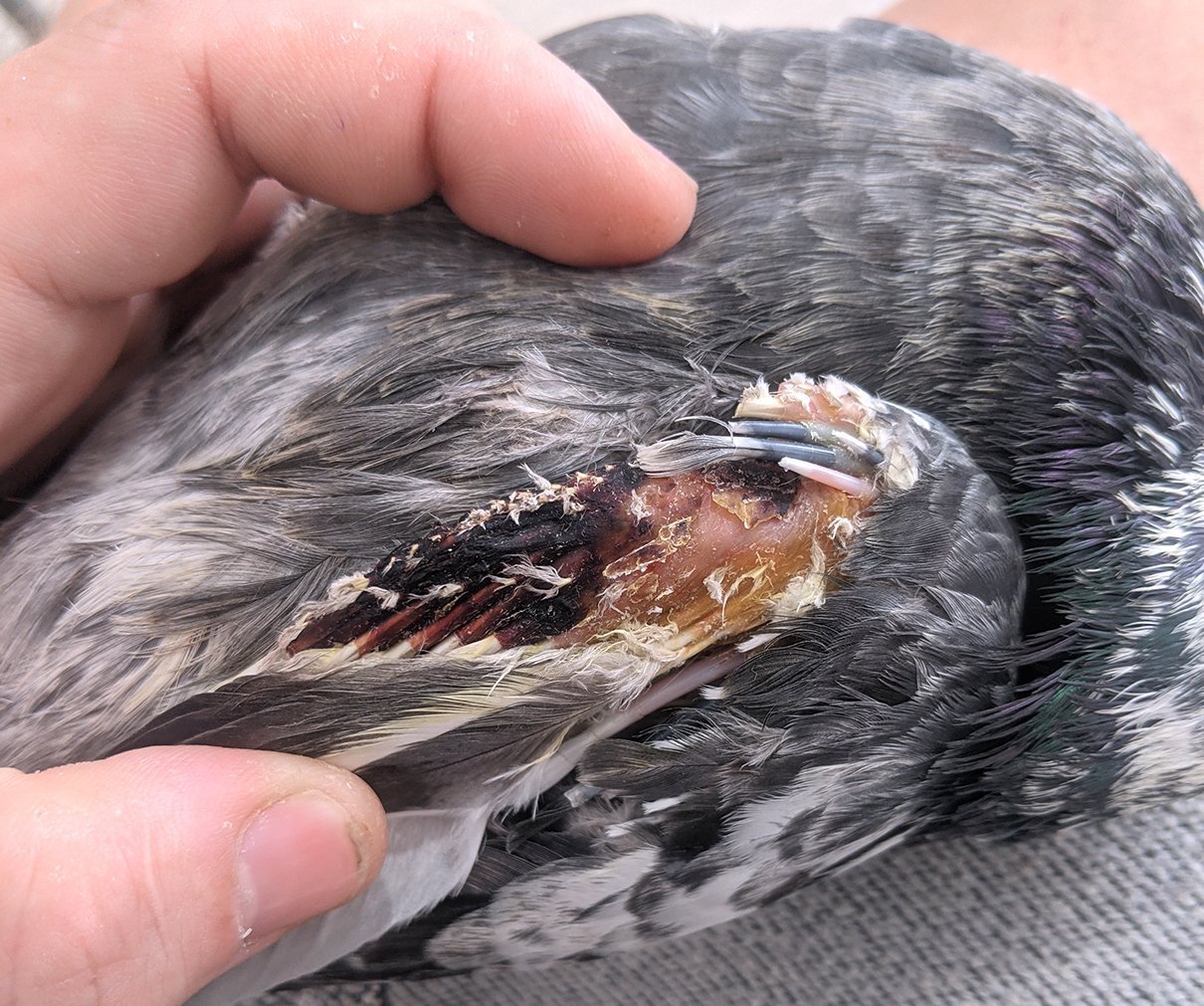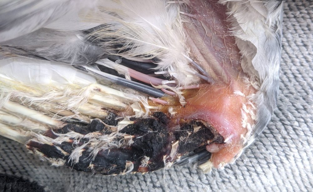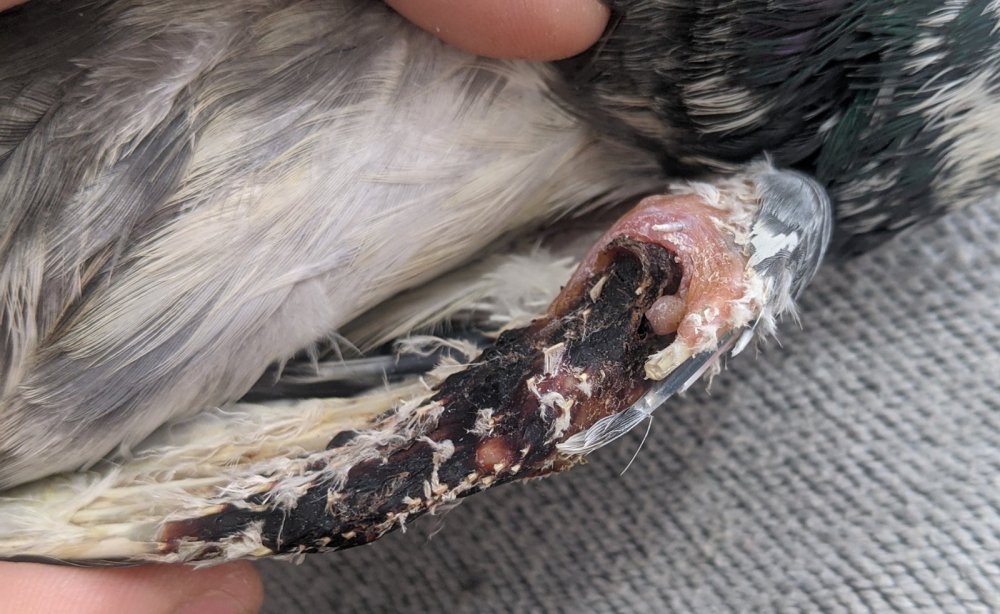 Продолжаю колоть цефтриаксона и поить метронидазол с нистатином. У крыльев связаны только кончики, чтобы крыло не висело, к телу не примотано, так как регулярно мажу смесью с обоих сторон. Но из-за того что оно крепко не зафиксировано он его беспокоит, когда я рукой к нему лезу (для лечебных манипуляций), он прыгает, бегает, пытается взлететь и тд. рана тревожится, короста немного отрывается от кожи. Но там тоже всё смесью промываю.