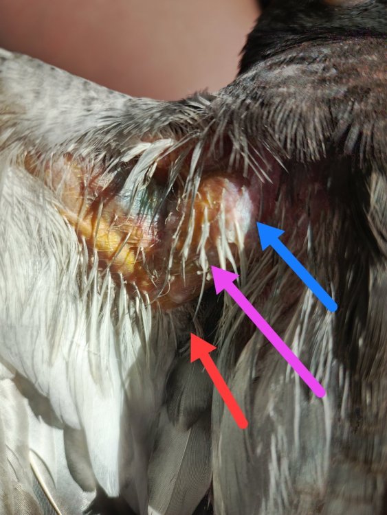 @маленький принц внутри с чернотой, похоже на синяк и прозрачная жидкость . точно не скажу, чувствуется жидкость скорее. С внутренней стороны отек вот тут. Сейчас найду как показать сверху. Там где мой большой палец - соединение плеча и предплечья, шишка получается чуть выше на плече. Надеюсь понятно описываю 🥺 То есть тут под моим пальцем это соединение, раз шишка выше значит не сустав ведь получается 🤔 @Катерина116 @маленький принц Красная стрелочка соединение плеча и предплечья Фиолетовая - шишка сверху расположение Синяя - шишка снизу , ну ее тут и видно. @Катерина116 @маленький принц То есть весь отек вокруг плечевой кости получается но снизу прям видно что мяско и отек в нем, а вот сверху именно шишка с чем то содержимым Он еще Бедный отбивается от меня этим крылом 😭 Пока фотографировала даже пищал (( больно видимо. Обычно молчит если уже на руках. Только когда берешь из клетки ругается и пытается драться...
