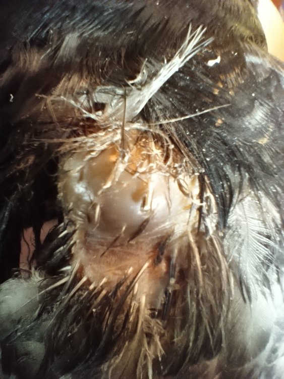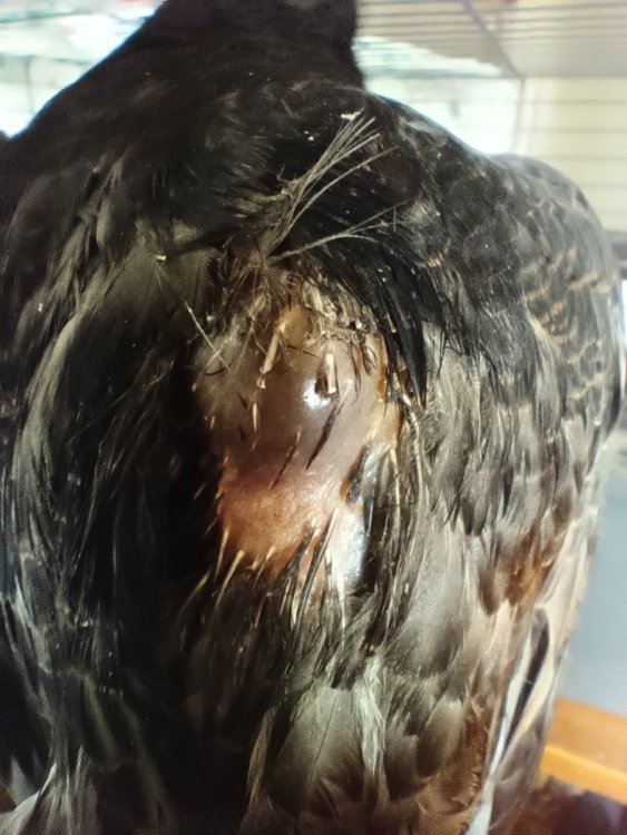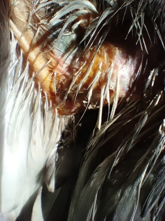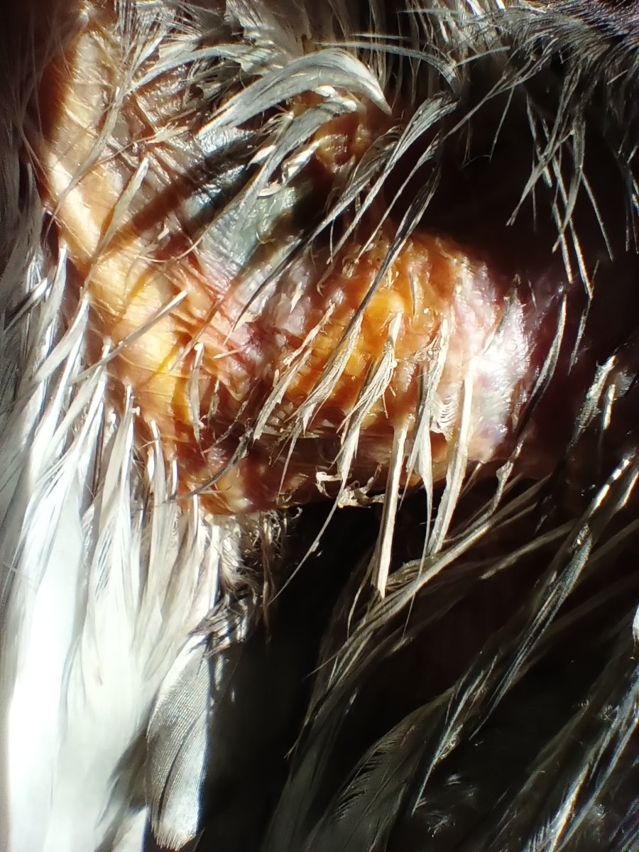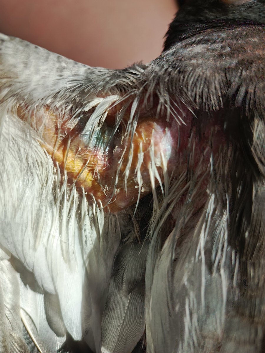 на компьютере выглядит не настолько страшно как выглядело когда смотрел с мобильного а с другой стороны крыла место напротив раны под перьями тоже покажите антибиотик уже начали? -