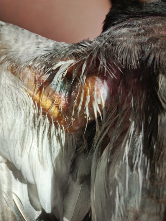 Пропала потому что болела сильно. С голубем в целом все неплохо, кушает, нормальный помет. Но я не смогла сделать снимок в связи со своей ситуацией. Синяк в целом спал, но вздулась шишка 😭 в месте травмы. Фото прилагаю @маленький принц посмотрите пожалуйста 🙏. Первые фото с внешней стороны, последние с внутренней стороны Шишка мягкая, ощущение что горячеватая. Сверху и снизу тоже но не параллельно друг другу. Снизу крыла ближе к телу отёк, а сверху подальше немного. Понимаю что без снимка все равно что гадать, но я сама только более менее оклемалась 🥺😭