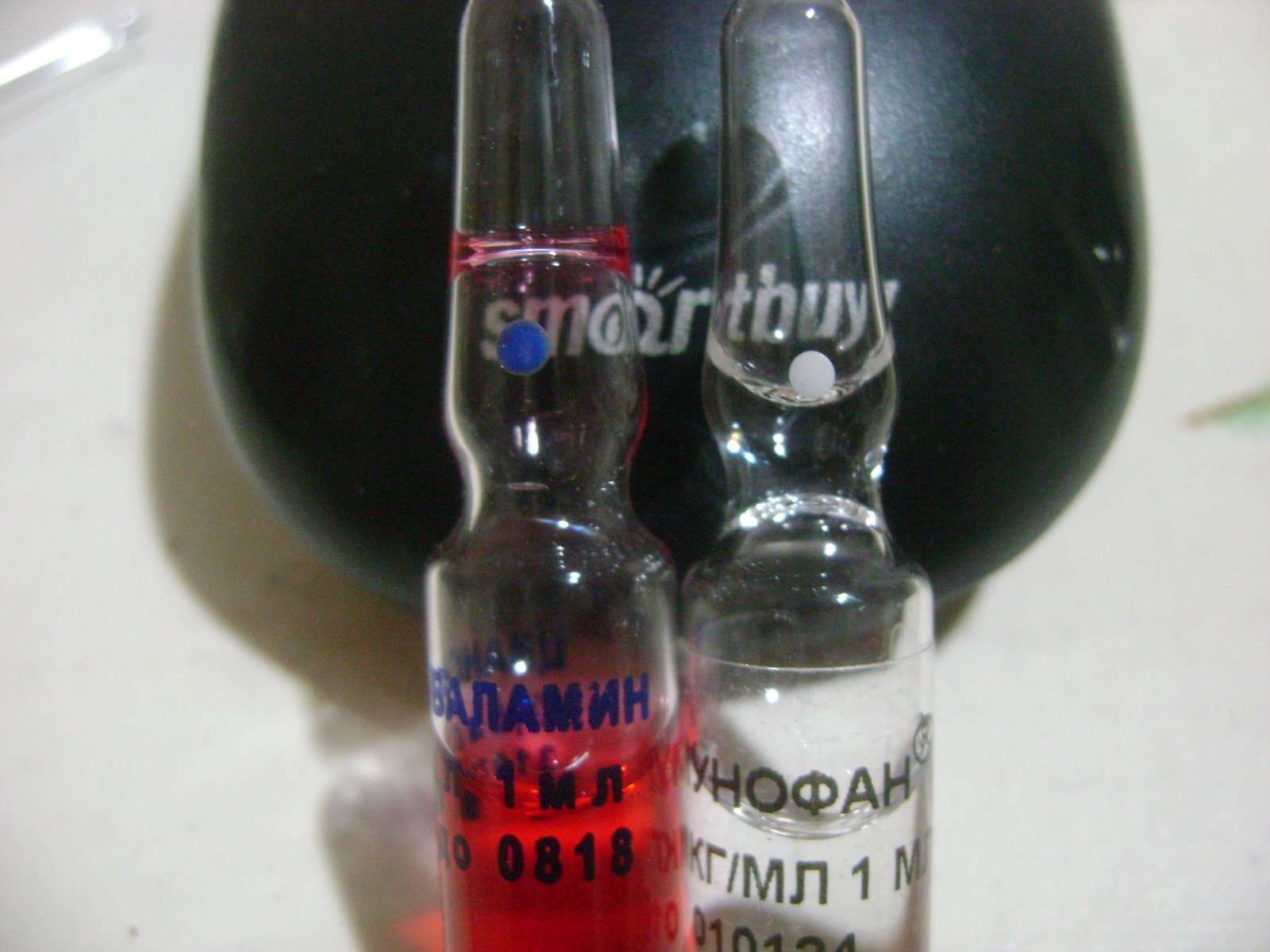 вот видите на ампулах точки синяя и белая -под ними имеется заводской надпил уже -риска для отлома на красном даж видно её