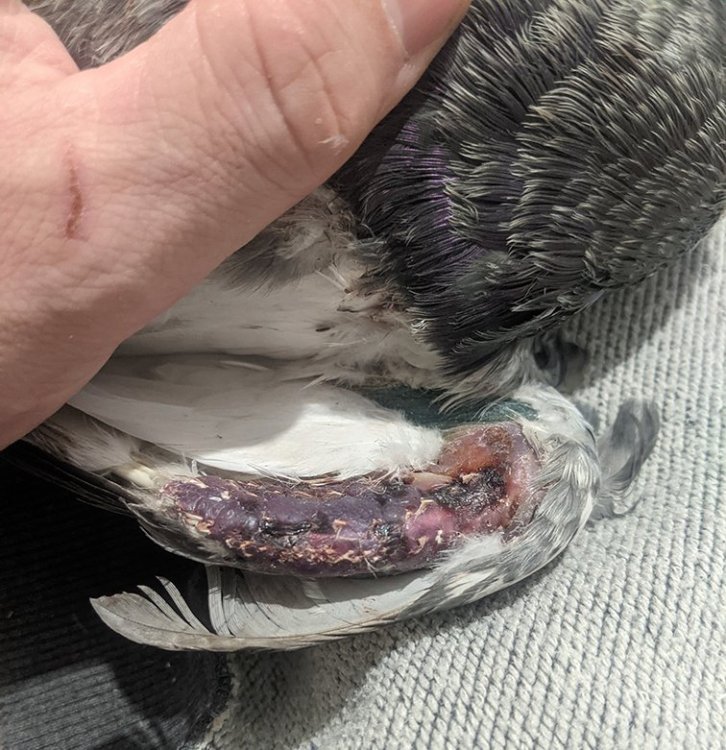 нужно СРОЧНО цефтриаксон внутримышечно и БЕЗ лидокаина колоть внутримышечно примерно вот сюда ВНИМАНИЕ в ту часть киля что ближе к попе колоть НЕЛЬЗЯ ВНИМАНИЕ при любых манипуляциях с птицей голову держать ВЫШЕ зоба чтобы случайно не захлебнулся содержимым при уколе иглу инсулинового шприца держать поближе к кости киля так чтобы если уколете не так игла упёрлась бы в кость чтобы не было синяков птицу держать так чтобы не дёрнулась при уколе для уколов лучше инсулинка с несъёмной тоненькой иглой после укола дать одну семечку без кожуры чтобы птичка не обижалась (взрослому в день не более 10 семечек чтобы не посадить печень) к антибиотику ОБЯЗАТЕЛЬНО нистатин 500.000 единиц четверть таблетки с водой через шприц без иглы в клюв дважды в день желательно за 30-40 минут до еды обрабатывать Смесью №1 в рану ОБЯЗАТЕЛЬНО доступ кислорода СОХРАНИТЬ КРЫЛО И ВНОВЬ ЛЕТАТЬ и Здоровья Вашему голубю!