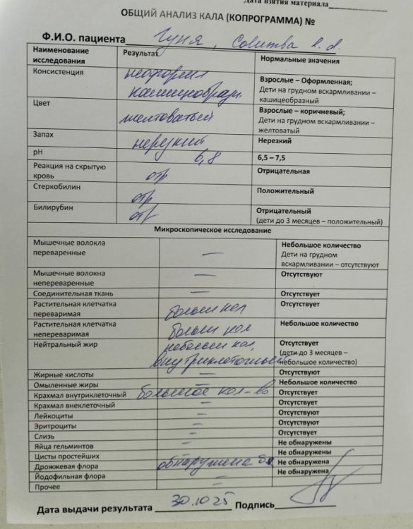 Вот и результат копрограммы.. После каши из пшеницы и гороха( Микробиолог написал - большое количество хлебных дрожжей.