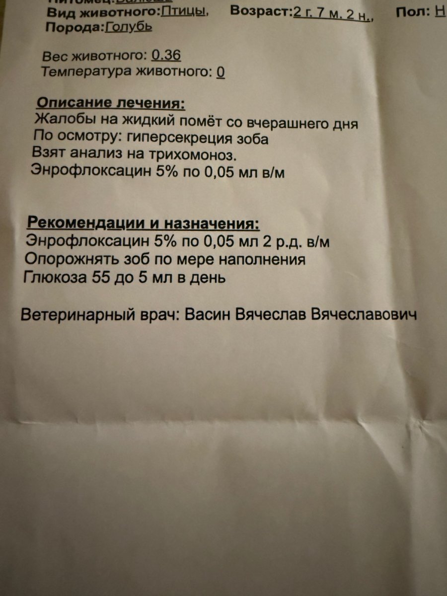Голубка Валюша, 2 года, живёт в квартире. 12 апреля заметили, что у неё понос (водянистые испражнения).Промыли ей зоб тёплой водой и помассировали, она отрыгнула светло‑белую слизь и большие куски непереваренной еды. До этого, мы замечали, что голубка хуже ест, не так активно клевала зелёную гречку и семечки (обычно очень любит). Предполагаем, что нахватала чего-то прихожей, скорее всего было занесено на обуви, плюс ко всему у нас промокли минеральные камни и они сохли пару дней как раз, поэтому она их не получала. Вечером 13 апреля отнесли птицу к орнитологу. Врач взял анализ на трихомоноз (через пару дней пришел отрицательный). Врач сразу сделал укол «Энромага» и сказал колоть этот препарат два раза в день до вечера пятницы (т.е. 5 дней) и продолжать 1 раз в день помогать ипражнять зоб, кормить молотым кормом с глюкозой, вводя его в зоб через инсулиновый шприц. Через день Валюше стало лучше, и мы продолжили лечение. В пятницу снова показали её врачу, он сказал сделать последние уколы до субботы. Сегодня, 21 апреля, выпустили голубку погулять по квартире, угостили зелёной гречкой и семечками, но через мин 15-20 вырвала. В рвоте были светлая слизь и кусочки корма. Подскажите, что это может быть? Возможен ли это грибок на фоне антибиотиков ?