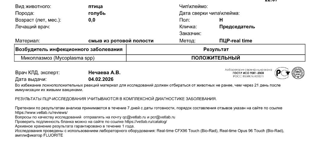 маленький принц! консультанты скажите пожалуйста, что нам дальше делать. дублирую краткую сводку у нас вес 135 сейчас примерно. состояние стабильное. не умирает. регулярно опорожняется. вот утреннее флук случайно меньше дозы давали все это время - в 10 раз меньше чем надо. пишеварение сейчас происходит медленно. но происходит. ну то есть зоб уходит непрерывно хоть и не быстро признаков рахита нет - киль прямой ножки крепкие не смотря на травмы до этого. не разъезжаются. уверенно ходим. вот еще раз анализы нужно ли начать флук в нормальной дозе? и можно ли начинать сейчас докси? сейчас принимаем получается только гепатовет (~0.13 2р/с) нистатин (1/3 2р/с) и флук в неправильной мелкой дозе 0.07x2р/с не считая панкреатина пробиотиков и кальция по птице вижу что он ждет когда же наконец ему начнут давать нормальный антибиотик. прям сидит и терпеливо ждет.