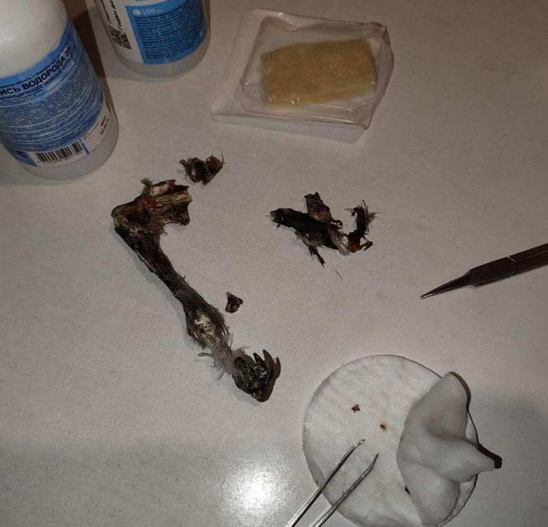 ПИПЕЕЕЕЦ! Птицо иногда ходит гулять с остальными, наловчился даже летать на своих обрубках. Сегодня воспротивился загону в коробку, полетел по шкафам, зацепился своим мумифицированным крюком за полку и НАДОРВАЛ ЕГО. Под слоями спёкшихся перьев было видно, как гнилая часть откололась от свежей. Из оставшейся косточки и откуда-то из-под бывшего бедра сочится много крови. Момент отрывания не сфоткали, сразу промыли хлоргексидином и приложили гемостатическую губку, она уже прикипела, отрывать пока не буду. Чё делать-то? 😢