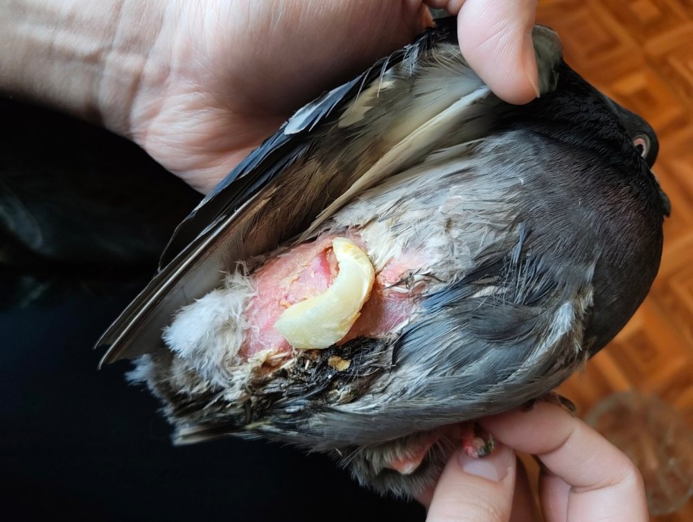там глубокая рана и нужно ОБЯЗАТЕЛЬНО ДОСТУП КИСЛОРОДА прошло больше недели и у птицы какие-то кровоподтёки каких быть не должно
