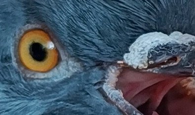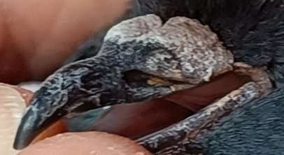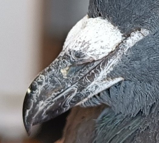 было вначале сегодня сегодня Восковица стала более неоднородная, бугристая. Роговой слой тоже вроде хуже стал, насколько неровный на ощупь можно проверить. Налет по краю хоаны на нижнем фото вроде того, что в углах клюва. А на втором фото внутри хоаны возможно то же, что внутри клюва образуется, а не сопельки. Ну и в углах клюва белые наросты точно не сопельки.