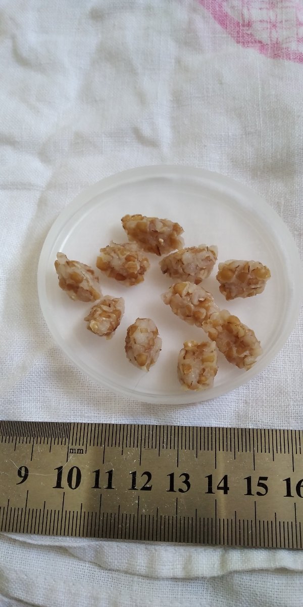 имхо лучше шарики а не жидкую кашку если каша несколько дней стабильно хорошо переваривается примерно за три часа нужно попробовать полчайной ложки запаренного зерна запаренное зерно это залитое кипятком вместо варки если хорошо переваривается то постепенно переводить на запаренное зерно если запаренное зерно несколько дней стабильно хорошо переваривается нужно попробовать полчайной ложки сырого зерна если хорошо переваривается то постепенно переводить на сырое зерно и всё это время продолжать лечение регулярно отписываясь на случай необходимости коррекции лечения -