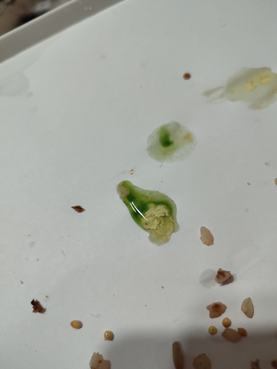 @Юлия_03 Расторопшу можете давать вместе с Гепатоветом во время еды 2-3рд, по небольшой щепоти. По Тербинафину оцените время появление симптомов, если они появились на 2-3день, то да можно предположить связь. если раньше, то не причем. Сопли и слизь в носоглотке - обычно признаки респираторного заболевания. Вряд ли это из-за триха или аллергии. После курса Метронидазола, возможно, придется этим заниматься. Кормление - если нормально переваривается, так, как вы кормите, то продолжайте. Но вообще говоря, желательно не смешивать кашу и сухое зерно, если пишеварение нестабильное. Чтобы не затормозить ЖКТ. Или то ли другое. Если зерно плохо переваривается, то уходите на кашу. По количеству у всех по-разному. Одной средневязкой, калорийной пшенично-гречнево-овсяной, например, каши для 300гр птицы нужно 60-90 мл в сутки. Фото помета обоих.