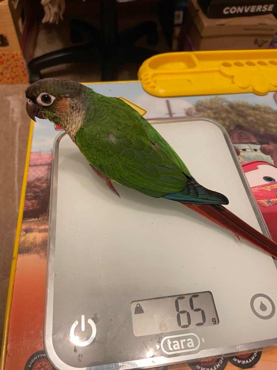 Приветствуем всех! Кексу скоро исполнится пять месяцев, и птаха уже начинает сбрасывать свой птенцовый прикид. 😦 Сначала мелкие пёрышки то тут, то там находили, а на днях уже два длинных пера из хвоста сбросил. Головушка и шея в трубочках новых пёрышек, но настроение вроде не портится пока - активный, любопытный, кусучий иногда. Смеёмся - дичает наш выкормыш. Но с нас не слезает практически всё время, когда гуляет. Замечательная сладкая птаха. 😍 Взвесили его, 65 грамм - это нормальный вес для пирруры?