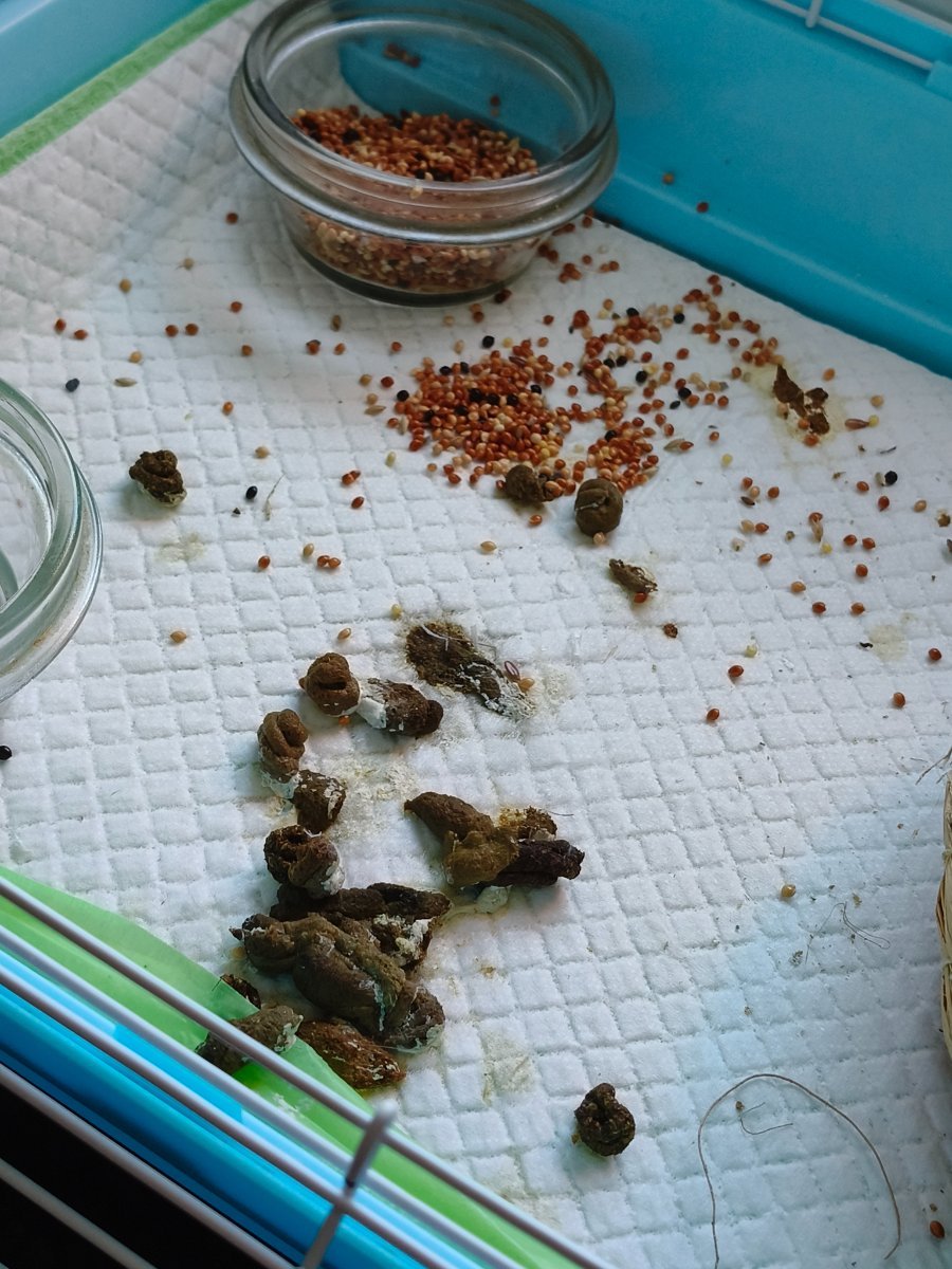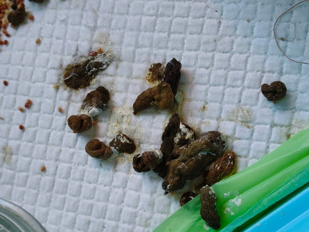 Здравствуйте! Кузе 2,5 года. Болели неоднократно кандидозом. Лечились по схеме Дельфина (спасибо огромное ей!❤) нистатин + ветоспорин-ж + от себя полисорб. В поилке - вода с лимоном или с активированным углём Сейчас второй день нахохленный, вялый, мёрзнет (грею), очень мало разговаривает, сильно ослаб. Рвоты и поноса нет. От еды не отказывается, но такое впечатление, что есть сам не может. Кормлю детской рисовой кашей и его кормом (рио) с рук - ест сам. Не знаю, чем его лечить, рвоты и поноса нет впервые. Зерна в помёте нет. Неприятного запаха от Кузи нет. Вчера днём были "завитки"(помёт) ярко-зелёного цвета (зелени в рационе нет). Вчера и позавчера вечером сильно чихал с выделениями, но вряд ли простыл (у нас жарко, сквозняков нет). С анализами и орнитологами у нас полный провал, специалистов нет, я прошлый раз писала об этом. Отравление исключаю, доступа к нашему столу у него нет, хотя, может и съел что-то с пола (мусоринку какую-нибудь). Помогите нам, пожалуйста🙏 Спасибо всем ответившим! Помёт Кузи на фото ниже:
