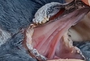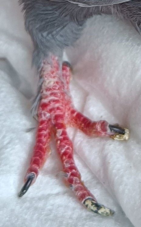 Правая нога не в фокусе получилась, левая нормально. Когда птицу брал в руки горячей она не показалась. Фото клюва тоже получились не в фокусе. То, что вчера не убрали там же и осталось (загнанные ваткой наверх ошметки на правой щеке). Возможно из-за того, что Ципрофлоксацин придавил палочку вылезло что-то респираторное, что до этого действовало бессимптомно. А вариантов много - микоплазмоз, орнитоз, туберкулез, аспергиллёз. Возможно завтра стоит подключить Доксициклин или Азитромицин.