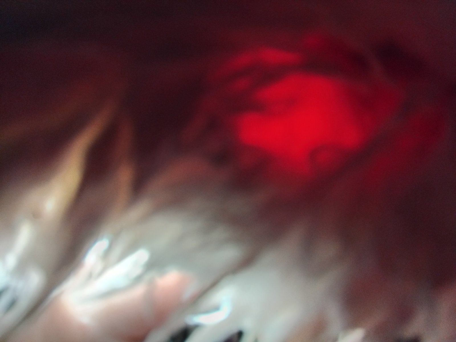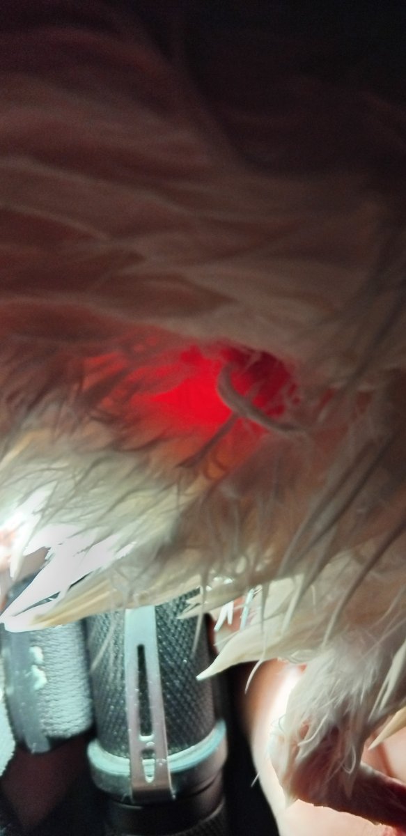 Рентген вызвал предположения о асците. Было рекомендовано сделать фото, просветив птицу фонариком. Место, для просвечивания выделено на рентгеновском снимке. Может фото и не лучшего качества, но одной лучше не получается. Скажу, что осмотрела весь бок от лап до хвоста- все так же как на фото равномерно малиново-красное.