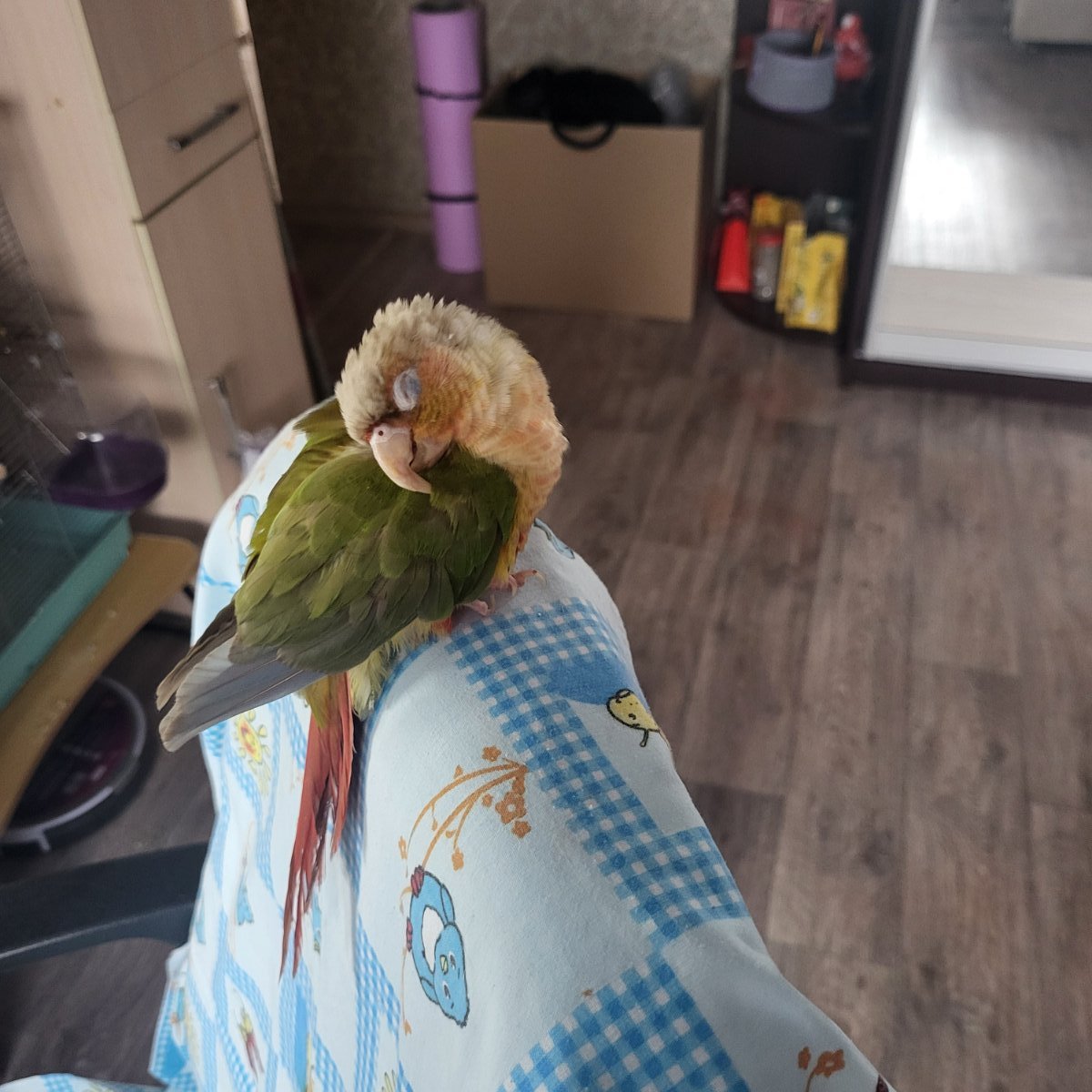 Добрый день! Вчера первый раз в корм подмешала минеральную смесь Рио с красной крышкой) Про орнитолона сказала, потому что именно так было указано в объявлении, орнитолог-специалист по птицам, попугаям в том числе, рекомендации по уходу и по лечению и ещё много всего). Вот так он спит. В клетке ночью, вроде, по-другому, головой чуть вниз. Фото помета чуть позже отправлю