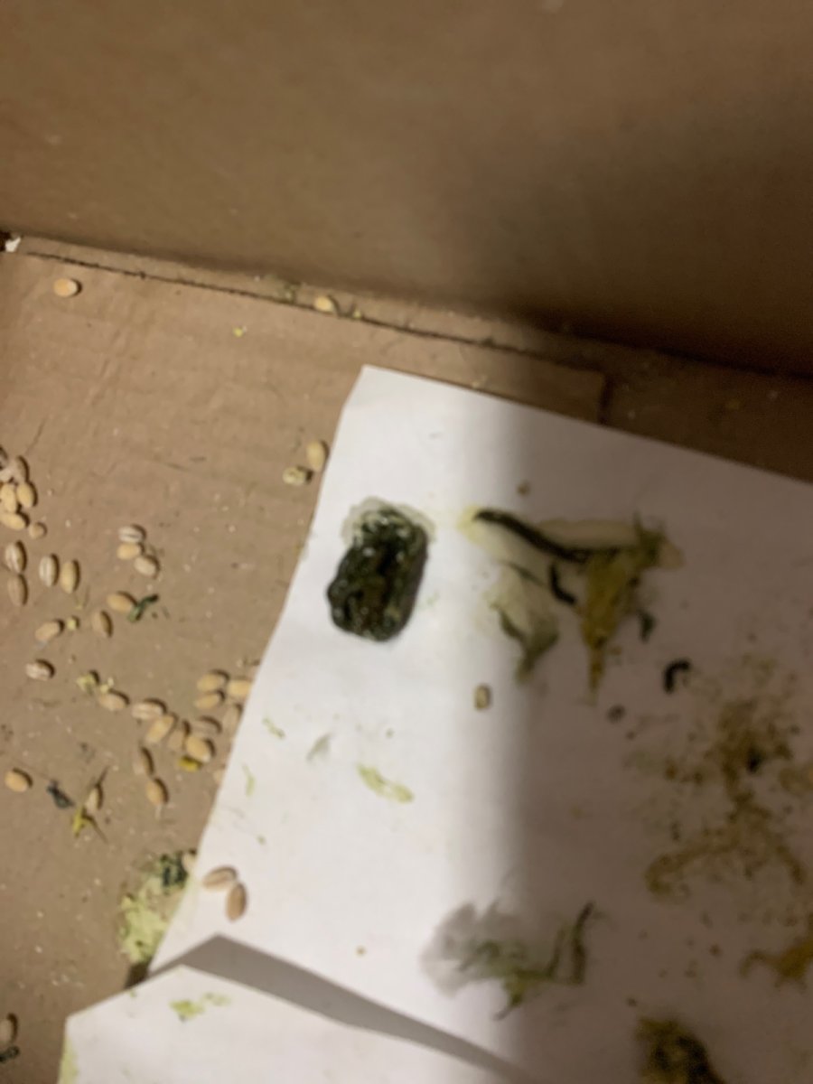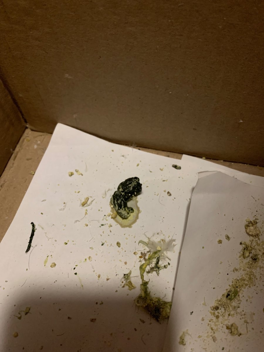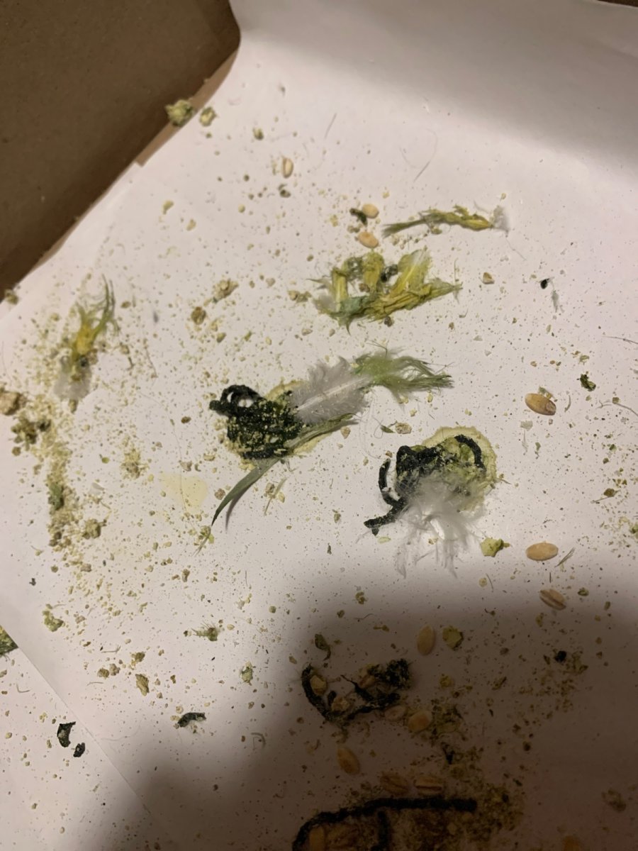 Вот фото помета он отличный сколько съел столько и выкакал просто сдерживал. Оказывается у него где попа комок с перьями говна слиплось и он его счищал. Вот клюв и был в помете. Я до очистила попу. Он отлично выглядит не вялый, стоит на ножках, чистит перья. Горло красное. Не могу понять есть ли ушиб. Может дать антибиотик? Горло полечить?