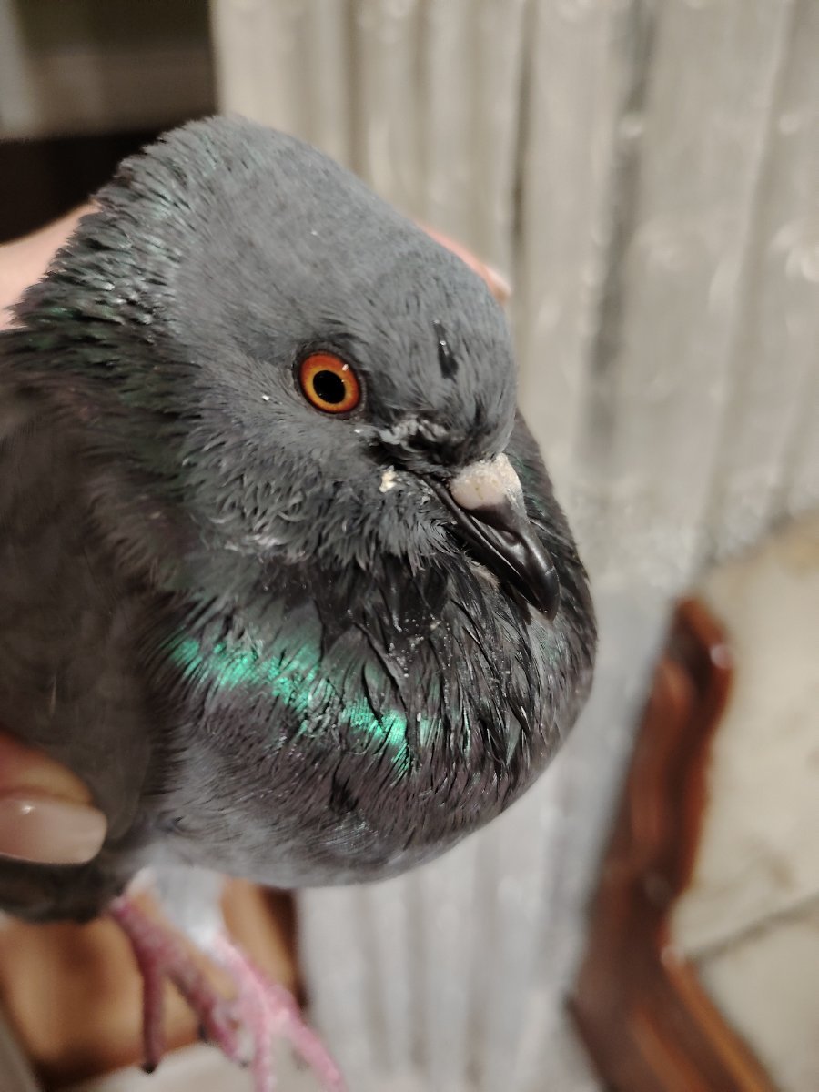 что с координацией? и что с ножками? на всякий случай СРОЧНО споить 0.3 мл инъекционного глюконата кальция курс две недели можно пожалуйста фото лица птицы? мне кажется что у Вас малыш чем кормить и что НЕЛЬЗЯ https://www.mybirds.ru/forums/topic/111964-sizarikinarodru/ как кормить если не ест сам https://www.mybirds.ru/forums/topic/34206-prinuditelnoe-kormlenie/ про голубят http://www.mybirds.ru/forums/index.php?showtopic=33566 как держать дома https://www.mybirds.ru/forums/topic/122247-golubi-tozhe-domashnie-pitomtsy/ когда начнёт летать чтобы не бился об стёкла познакомьте со окнами и зеркалами: поднесите к стеклу так чтобы коснулся грудью и клювом а затем дайте потрогать самому если на приёме у ветеринара случайно окажется коновал предлагающий усыпление на усыпление НЕ соглашайтесь (бывают коновалы которые сразу придумывают надуманные причины для платного усыпления) ВНИМАНИЕ при любых манипуляциях с птицей голову держать ВЫШЕ зоба чтобы случайно не захлебнулся содержимым (если же нужно например для рентгена уложить птицу на спину то зоб должен быть пуст для этого за три часа до переворачивания на спину НЕ кормить и НЕ поить) ВНИМАНИЕ при кровотечении греть НЕЛЬЗЯ раны промывать хлоргекседином (можно мирамистин) йод, спирт и зелёнку НЕЛЬЗЯ из-за химожогов очень тонкой нежной кожи кровь (НЕ на голове!) останавливать перекисью водорода (ВНИМАНИЕ БЕРЕЧЬ глаза) ВНИМАНИЕ сушить или греть феном птиц НЕЛЬЗЯ птицы очень легко травятся запахами горячего пластика потому что их лёгкие способны дышать разряжённым воздухом на огромной высот поищите в супермаркетах в отделах здорового питания или в веганских пшеницу или полбу (рожь НЕЛЬЗЯ) (если не найдёте пшеницу или полбу то можно булугур) основа корма ~50-60% пшеница/полба а остальное смесь круп: гречка (лучше зелёная), мелкая чечевица, колотый горох, маш, овёс без кожуры (овёс в кожуре и хлопья НЕЛЬЗЯ) так же купите в аптеке недроблёные цельные семена/плоды растаропши и давайте как часть корма [b]бюджетный вариант корма:[/b] перловка в качестве основного корма (при условии если у птицы нет истощения) (если имеется истощение то перловка слишком низкокалорийная и нужно всё же пшеницу) кормите так: 1. первая кормёжка до полного зоба перед работой 2. вторая кормёжка после работы: накормите примерно на половину чтобы зоб освободился за пару часов 3. третья кормёжка как зоб освободится перед сном до полного зоба в выходные дни кормите после каждого полного освобождения зоба ВЫЖИТЬ и Здоровья Вашему голубю!