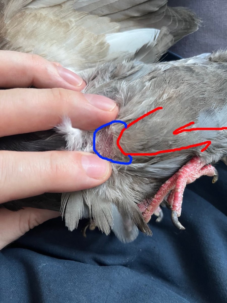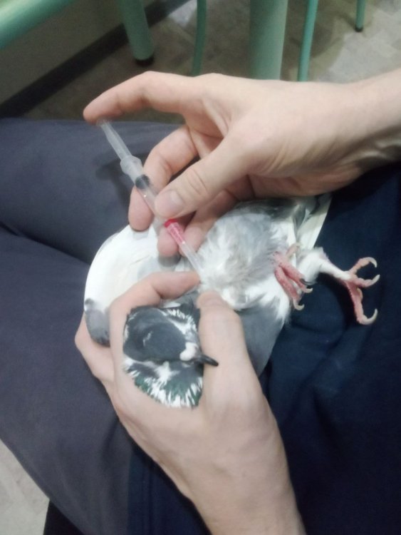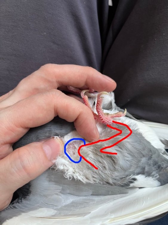 Вы возможно меня не так поняли. Сфотал сейчас - красным выделил где под перьями лапа находится. Синим выделил место, где колю. Прямо около коленки - либо ближе к бедру либо к голени. Там много кожи, и 1.5-2мл за раз точно. Из сложностей - нужно только пуховые перья раздвинуть и до кожи этой добраться. Ну и голубя крепко держать. У меня в другие места не получается колоть. P.S. Я не специалист, но как мнение - если голубь пьет сам, может все же попробовать споить ему метронидахол, если с уколами проблема. -
