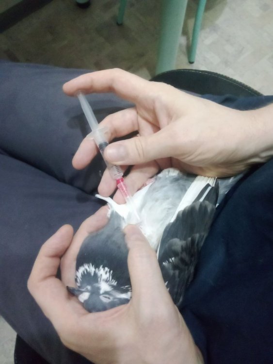 Спасибо! С 4 попытки смогла вколоть 2 мл из 5 (минус 3 на неудачные попытки). Голубь очень вырывается, как вам удается обездвижить его в таком как фото положении? У меня он дергает лапками У него перед уколом клюв и всё вокруг было мокрое, как после воды — может, все-таки пытался попить? -