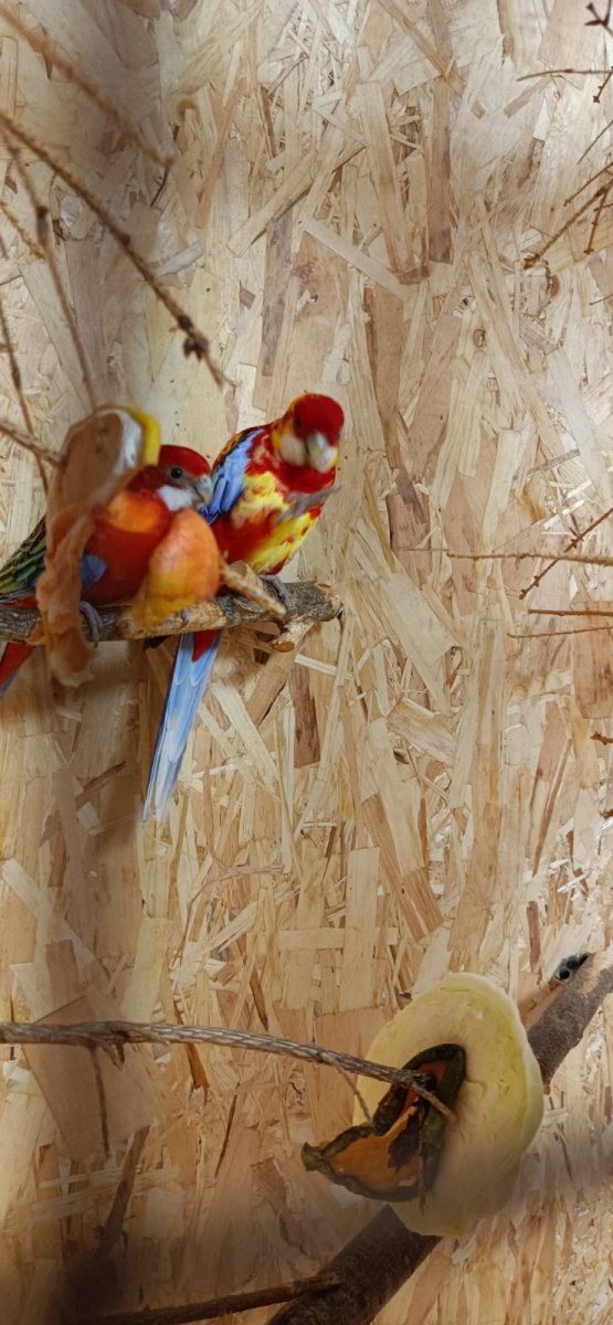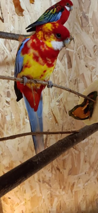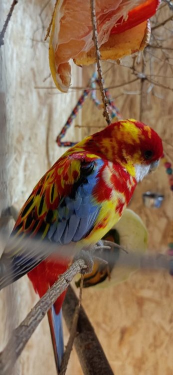 Мальчик розеллы, 9 лет. Изначально был красным, но в возрасте примерно 5 лет, стали появляться жёлтые перья. Изначально появилось одно жёлтое пёрышко на голове но с каждой линькой их становилось всë больше. Сейчас жёлтые перья заменили уже примерно 40% красных. Вопрос - видел ли кто нибудь, такой окрас у пёстрых розелл? Ps. Фото до преображения у меня на аватарке) -