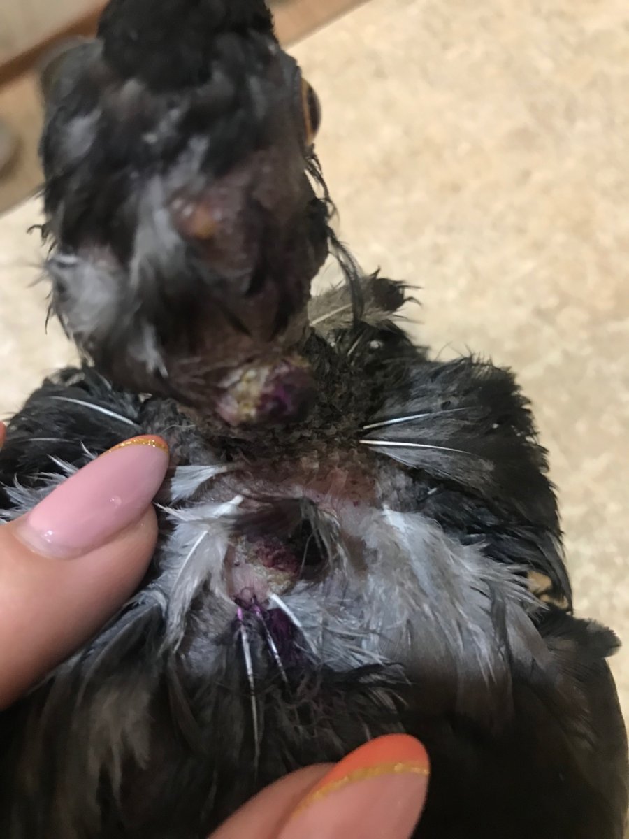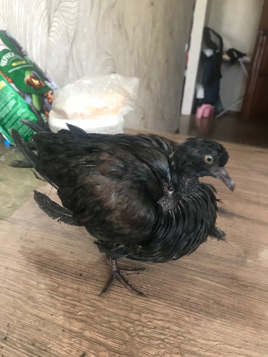Добрый день! Подобрала на работе голубёнка в конце августа, кого возраста не знаю, но ещё пищит. Он упал в отработанное машинного масло и сажу. Чистила его крахмалом и мыла ферри, но он ещё до сих пор пачкается. Много перьев слинял, и начали появляться какие то наросты, сначала были в виде папилом, потом стали сухие и твёрдые, на хвосте тоже нарост твёрдый. Хотелось бы узнать, как от них избавиться? - Сегодня