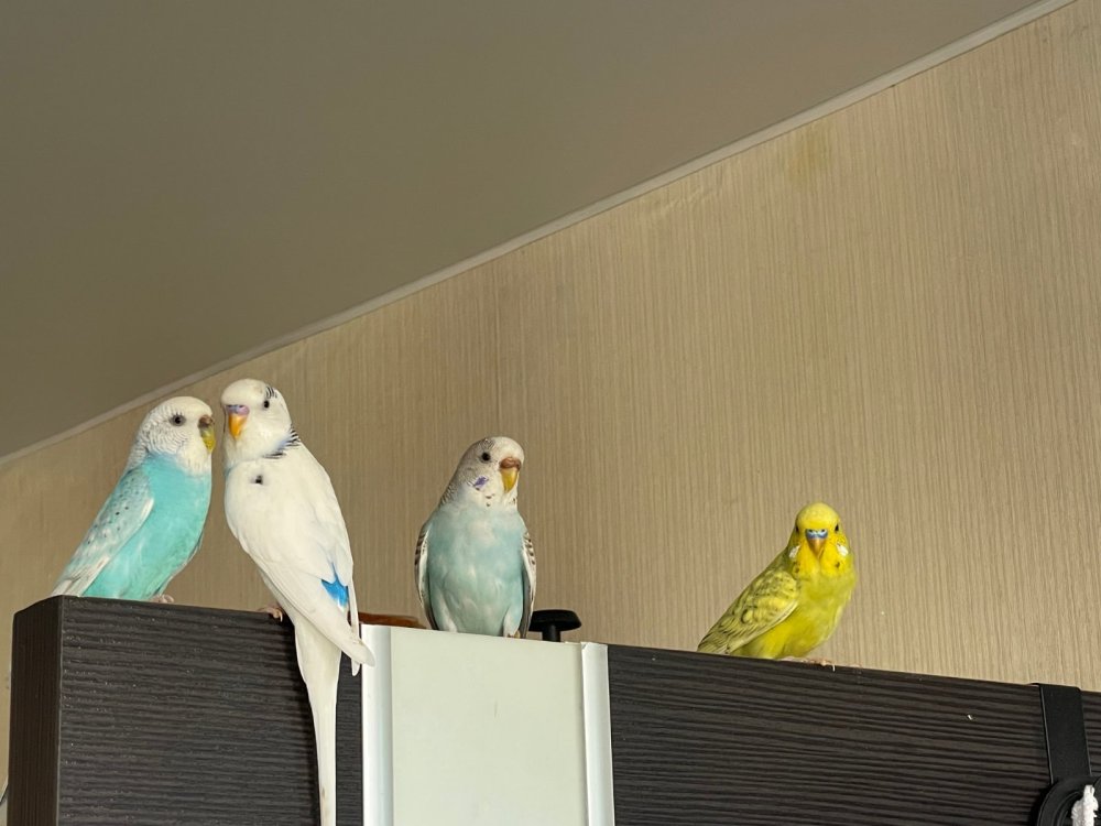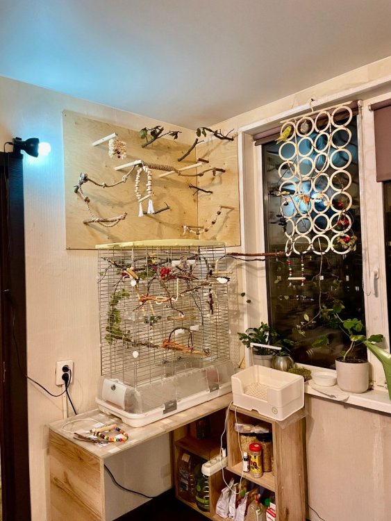 Добрый день уважаемые форумчане! Несколько вопросов к опытным держателям волнистых попугайчиков. Дано: две пары. Одна пара возраст чуть больше года обоим, вторая пара возрастом 5 и 5,5 месяцев. Общая большая клетка, обустроено место для дневного времяпрепровождения, полетов, все в одной большой комнате, там же душ с фильтрованной водой, копошилки сама собираю, едят разнообразно все вместе, весь день летают, вечером сами заходят в клетку. Прикрепила фото условий содержания. В рационе замочка, пророст, зелень пшена и овса, зеленая греча, луговые травы, свекла, раз в неделю яйцо, фрукты(не едят), в клетке – глиняные печеньки разные своего производства, в минеральной кормушке : глина кусковая пищевая, мел пищевой, кусочки брикета рябушка, висят: сепия, минеральный камень, мин. Смесь, сушеные фрукты. Корм Султан основной рацион для волнистых. Так вот такие вопросы. Старшую пару взяли месяц назад у других людей, такого разнообразного питания у них небыло и полеты были редкие. Месяц откормила, хватит ли этого для здорового потомства и без последствий для родителей? Можно ли сажать старшую пару на гнездо? Как это сделать? Понимаю, что нужна отдельная клетка. Куда ее ставить? В отдельную комнату и закрывать дверь, чтобы младшие не отвлекали или можно в эту же комнату, рядом с большой? Можно ли выпускать пару из клетки в период гнездования? Как лучше поступить? Или подождать до мая 2026 года и посадить обоих на гнезда в разные клетки? Нужно ли будет добавлять глюконат кальция паре в разводной клетке, если да, то в каком виде и в каких пропорциях? Полового поведения не наблюдала, но старшая парочка прям любовь-морковь… а вот младшие как дети, хотя они и есть еще дети. Буду очень благодарна за советы. Так же прикрепляю фото пар. Пара слева – старшая, пара справа – младшая. -