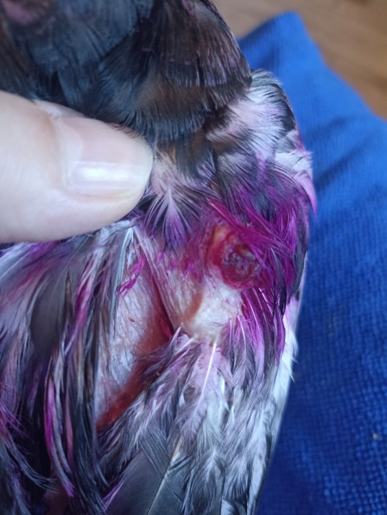Домашний голубь (6-7 месяцев) зацепился за веревку и повис на ней обмотав полностью крыло и шею. Когда сняли веревку, то сильно пошла кровь. Кровь остановили, но рентген до субботы сделать негде. осталась огромная рана, синяя вокруг кожа и выдернутые перья. сейчас близко сфотографировать рану не получилось, голубя невозможно удержать одной рукой. Дали ибупрофен примерно 0,3 мл (голубь многое выплевывал) и обработали рану смесью 1. Сейчас дышит уже с закрытым клювом, но крыло очень висит. И, естественно, не кушает. Только водичку попил. чем ему еще можно помочь?