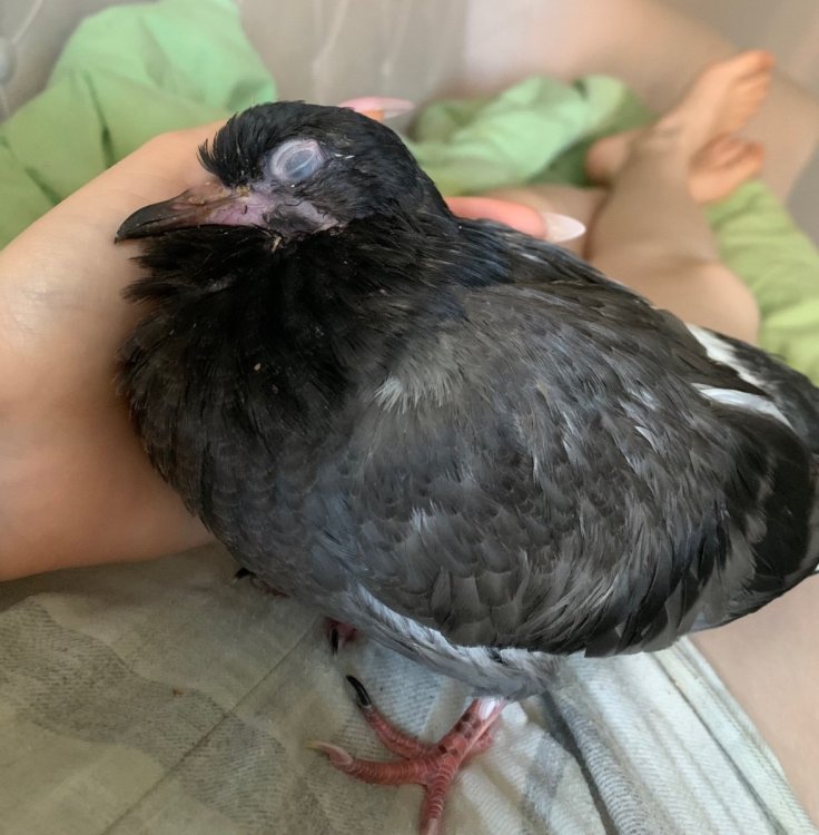 Сегодня птицу, видимо, совсем плохо. Обычно он в это время максимально бодрый и активный. Летает, везде лезет, за всем наблюдает… сегодня же только сидит нахохлившсь и с закрытыми глазами. Хрипит на каждый вдох. Клюв осмотрела, визуально слизи не видно. Клюв стал прохладным. Если до этого всегда был тепленький, как маленькая печка, то теперь прохладный. Исходя из моего скудного опыта, это недобрый знак. Но что самое страшное. Голубенок совсем ослаб. Прям слабеет с каждым часом. Когда кормлю, он и хочет вырвать клюв, а сил нет. Так еле-еле пытается сопротивляться. И даже шагает так осторожно-осторожно легко прям еле ступает. Если до этого он бодро прыгал, и в лапах ощущались хоть какие-то вес и сила. То теперь они будто невесомый. И ступает так прям аккуратно-аккуратно даже боязливо. Как будто силы совсем его покидают. Я тут сама приболела, вероятно, вирус какой-то подхватила. Температура под 39 была. Не знаю могла ли я его заразить…