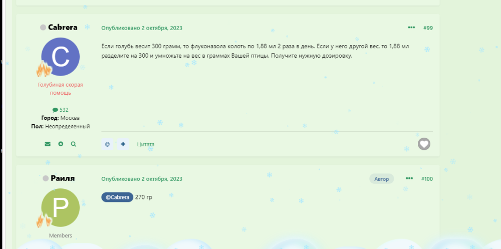 слушайте не пойму почему вы так не хотите мне давать инструкции по дозировкам флука? ну я реально боюсь этого интраконазола, он считается очень токсичным доя печени. а его биодоступность хуже он расщеплчется только одним ферментом. у нас шар в зобе. разве не может интраконазол там застрять просто? ну пожалуйста. я очень переживаю. по поводу этого лекарства совершенно точно неоднозначное мнение. ну расскажите поподробнее и про флук напишите я вас умоляю. он такой хороший птен. с утра давал 0.25мл