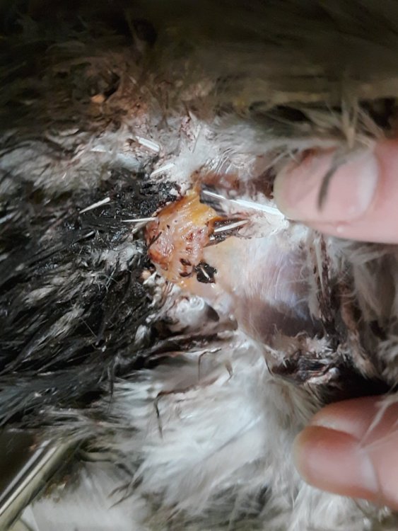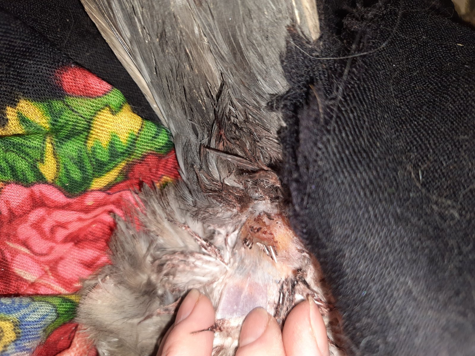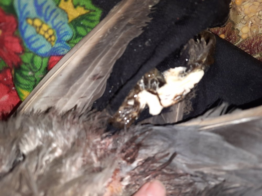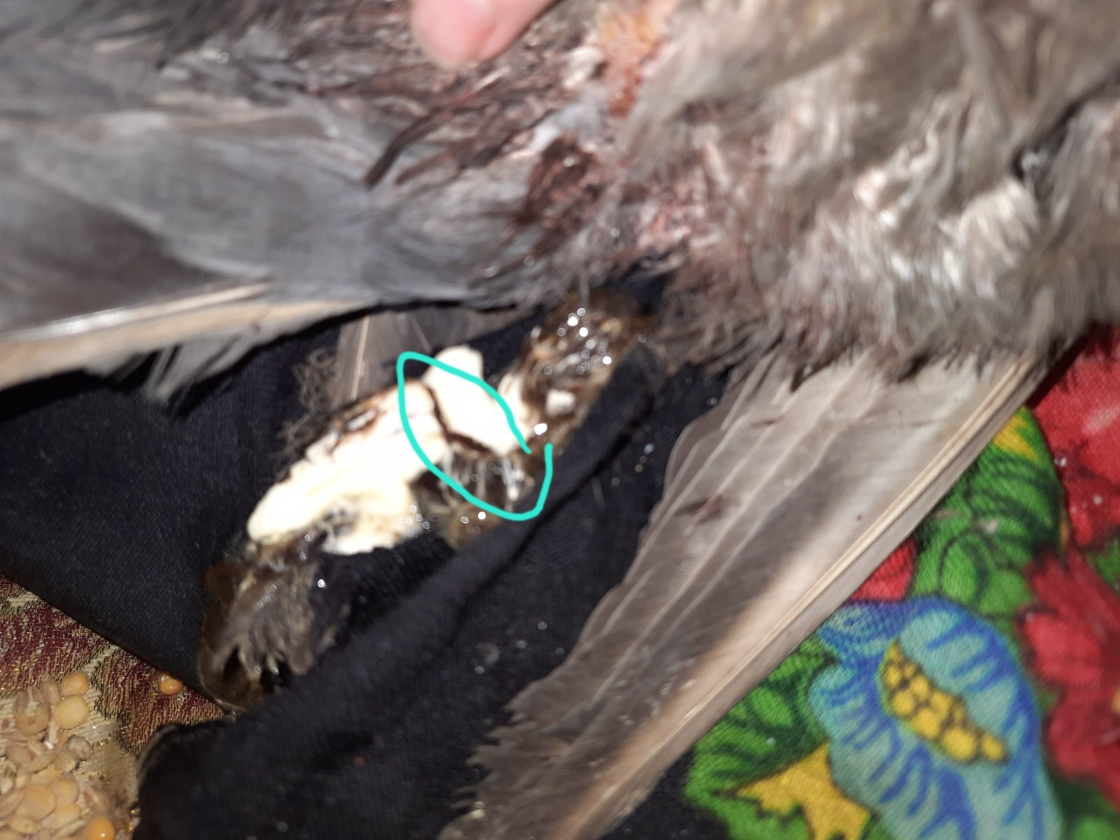 фото? СРОЧНО колоть внтримышечно цефтриаксон БЕЗ лидокаина (лидокакин птицы плохо переносят) колоть внутримышечно примерно вот сюда ВНИМАНИЕ в ту часть киля что ближе к попе колоть НЕЛЬЗЯ ВНИМАНИЕ при любых манипуляциях с птицей голову держать ВЫШЕ зоба чтобы случайно не захлебнулся содержимым при уколе иглу инсулинового шприца держать поближе к кости киля так чтобы если уколете не так игла упёрлась бы в кость чтобы не было синяков птицу держать так чтобы не дёрнулась при уколе для уколов лучше инсулинка с несъёмной тоненькой иглой после укола дать одну семечку без кожуры чтобы птиченька не обижалась (взрослому в день не более 10 семечек чтобы не посадить печень) от анаэробной инфекции ОБЯЗАТЕЛЬНО дополнительно метронидазол/метрогил к антибиотику ОБЯЗАТЕЛЬНО нистатин 500.000 единиц четверть таблетки с водой через шприц без иглы в клюв дважды в день желательно за 30-40 минут до еды на ножку смесь №1 шину долго держать НЕЛЬЗЯ уколите СРОЧНО внутримышено 0.1 мл инъекционно дицинона и 0.1 мл инъекционного викасола в поилку отвар крапивы или подорожника для улучшения сворачиваемости крови ВЫЖИТЬ и Здоровья Вашему голубю!