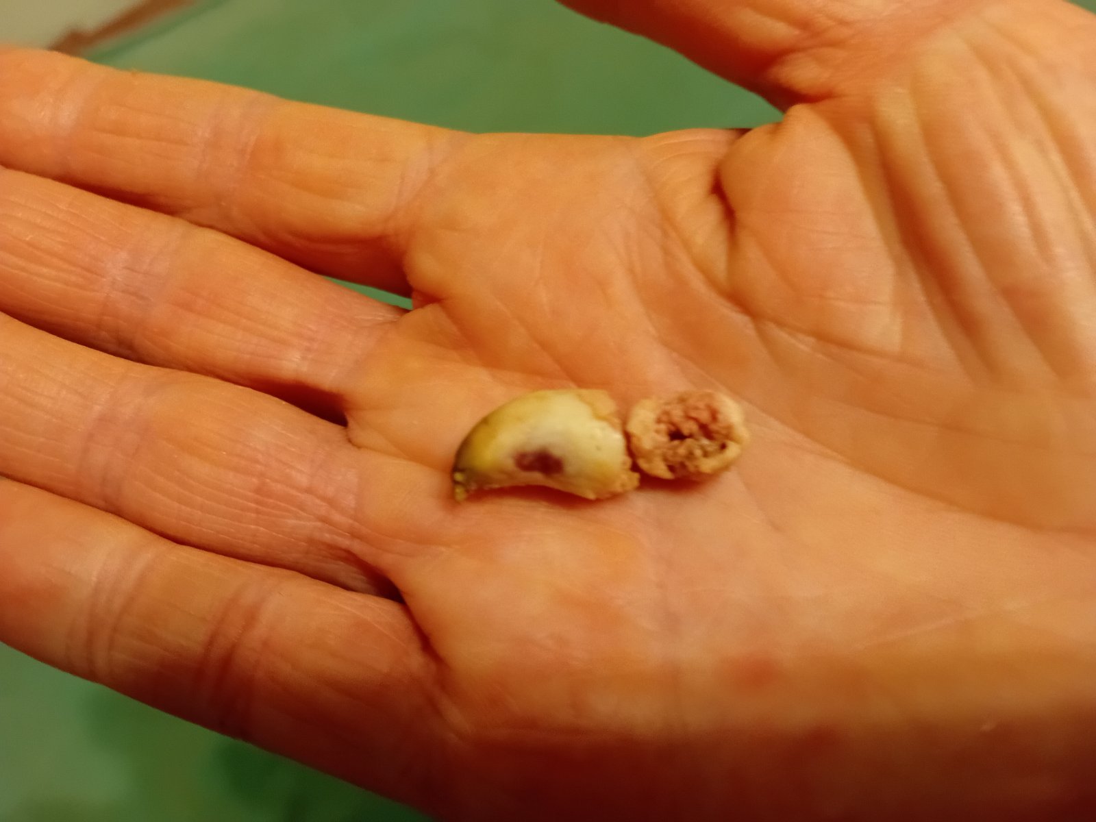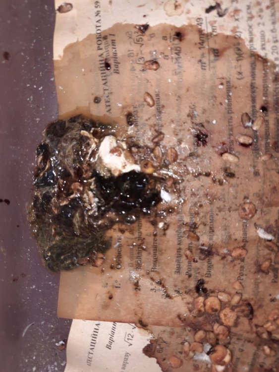 Здравствуйте! В мороз недавно подобрала на улице голубенка. Заметила, что он не ел, как ели остальные голуби, которым я насыпала корм. Держался подальше от всех. Я его поймала - думала, что он замерзает. На улице минус 20 было. Пока ловила, у него вывалился хвост. Принесла домой - вялый, не ест, не пьет. Еще пищит. Но внешне не совсем уж маленький. Насыпала ему корм - умеет есть только гречку. Я ему насыпала много гречки. Через пару дней заметила, что он вообще не притрагивается к еде. Киль чрезвычайно острый! Начали кормить принудительно горохом. Горох медленно переваривается, поэтому кормили раз в сутки. Думали, что доест сам гречку, если проголодается, ведь он уже умеет ее есть. Зоб после гороха почти сутки большой. Так прошло еще 3 дня на горохе. Потом поняли, что на одном горохе нехорошо жить, стали давать размоченную пшеницу: утром и днем пшеницу, вечером пшеницу и горох. Сам не ест! Не пьет! Сидит нахохлившись в темном углу неподвижно. Крайне истощен. Неясно, почему не ест, если умеет гречку есть. Живет у нас уже дней 7-10. Кормим принудительно. Очень сильно вырывается, поэтому заворачиваем в ткань. Для этого я приспособила кусок от хлопковых женских колгот - в колготину его засовываю через голову. Когда снимала однажды, заметила, что одно крыло стало подвисать, хотя снимать старалась аккуратно. Теперь он одним крылом может махать, а вторым не машет. Но я же не ломала ему крыло, тогда почему так? Самое плохое было сегодня вечером: увидела, что из клоаки у него выпала что-то типа капсулы бежевого цвета длиной примерно 2 см, шириной почти 1 см. Выглядит по размеру как не маленькая фасолина, овальной формы, с небольшим заострением на конце. Плотная, но когда ногтем я на нее надавила, увидела внутри розово-красноватую массу непонятно чего. Что это??? Никогда ничего подобного не видела в жизни! Это глист такой??? Или что это? Страшновато как-то! Прилагаю фото. Как ни странно, после того, как он это выкакал, стал причесывать себя, чего раньше не было. Я ему даю Амоксиклав, потому что помет у него какой-то бесформенный и желтый. На фоне этого антибиотика и вывалилась эта фигня.