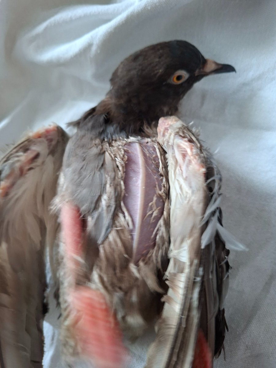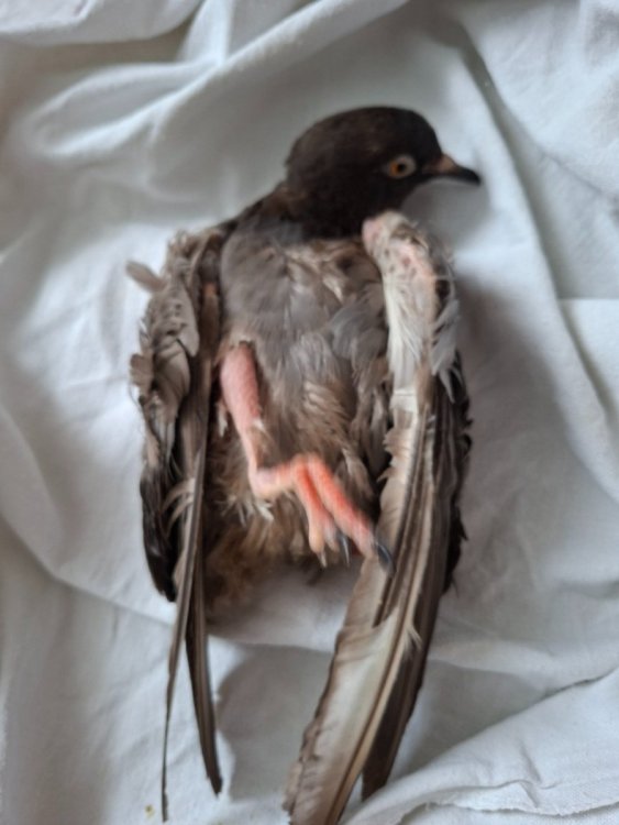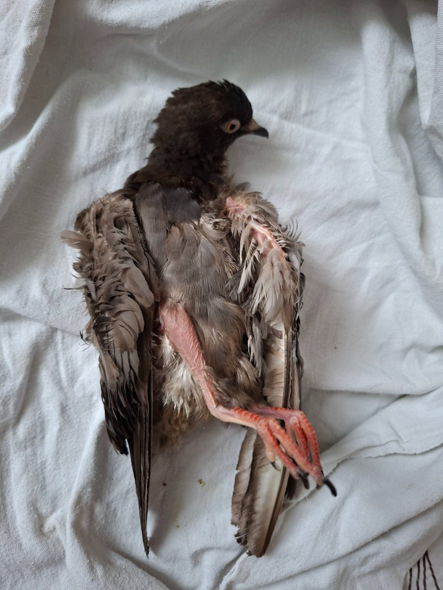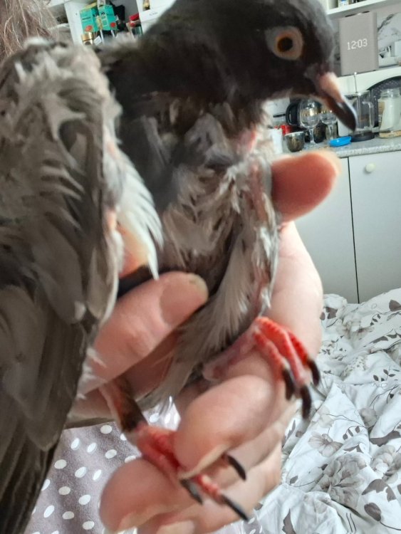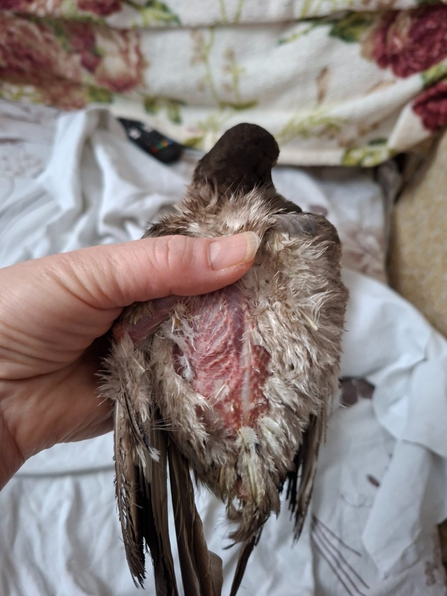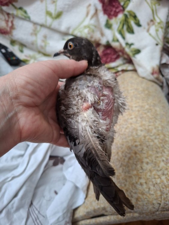 Спасибо за отклик! Грудка искривленна, скошенна. Евая сторона тела была сильно повреждена. Сейчас намочила перышки для фото. Лежачий/ручной. На лапках не стоит-заваливается налево на спину. Левая лапа почти без сил и левое крыло не расскрывает-опухший сустав крепления плеча... были перелом крыла, проблема с суставом и ключицей... Активно машет правым крылом, трудно удерживать в руках. Помахивалось по инерции левое крыло, но так и не разработалось. Клюет активно, закончила давать после поноса Линекс и Гепатовет.