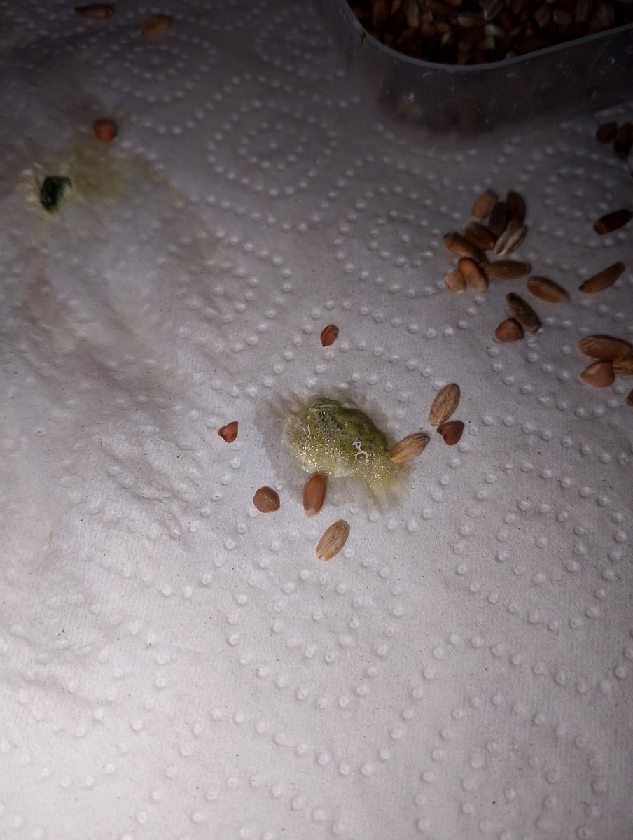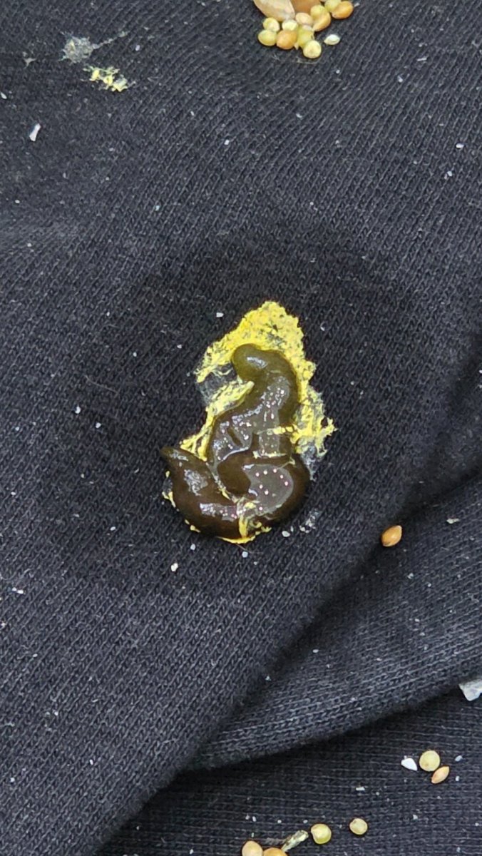 Фото помета позавчера,а вчера не сохранилось,но было в виде кренделька,и цвет такой болотный,не ярко зелёный.Уже злится ,когда брать его начинаю в руки,он пытается ударить крылом меня. Это свежее,сейчас сходил Как то стало жидко..может воды много пить даём? -