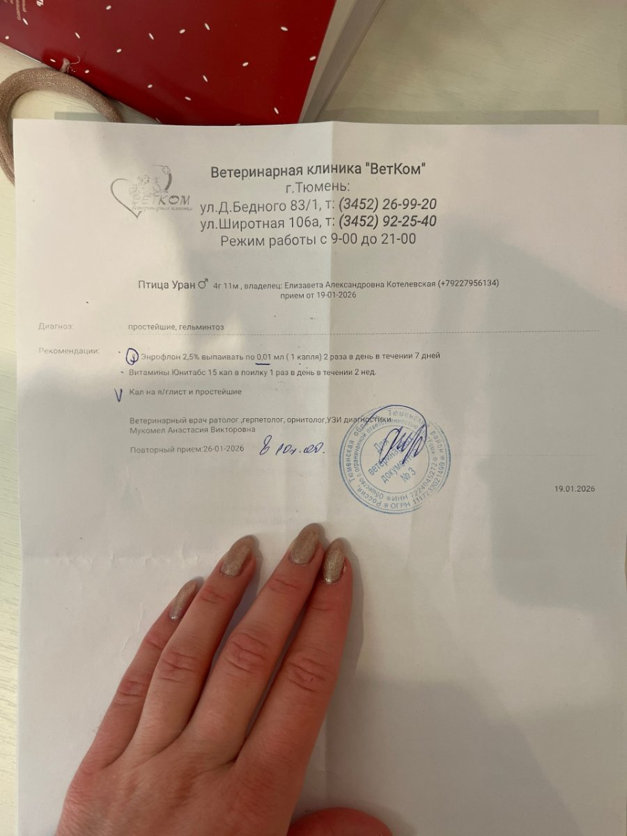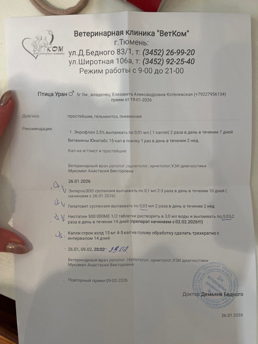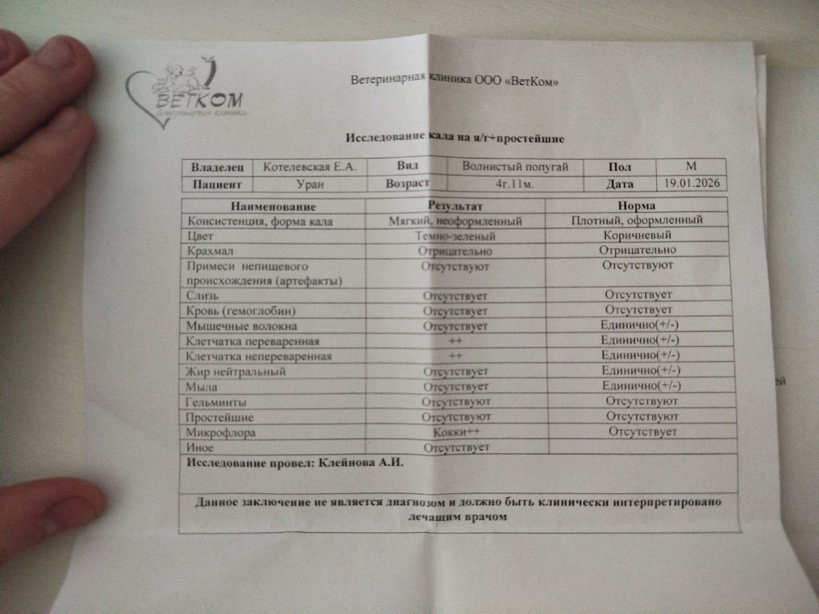 Шаблон вопроса форума: Болезни волнистых попугаев Вид: Волнистый Пол попугая: Самец Возраст попугая: 5 лет Название корма (производитель): Рио Суточная порция зерносмеси на попугая: 2 чайные ложки, норму не съедает. Сезонные овощи (кабачок, тыква), иногда морковь и яблоки, салат. Есть ли в клетке минеральный камень, мел, сепия?: сепия Получает(л) ли попугай витамины?: прописывали Unitabs. Пока пропил неделю. Длина светового дня попугая: 12ч Размеры клетки: точно не знаю, просторная, квадратная. Расположение клетки с попугаем: на комоде в спальне. Болел ли ранее попугай?: Да Симптомы болезни, которые вы наблюдаете: все началось с того, что попугай часто сидел нахохленный, часто спал. Затем испортился помет: в помете много воды, сам помет тоже неоформленный, временами выходит одна вода с мочой. Я посмотрела помет под микроскопом, обнаружила необычные образования. Отвезла попугая к ветеринару посоветоваться, сдала помет на копрограмму. Ветеринар предположила, что это цисты. Но такие же образования я находила при микроскопировании корма (разве что чуть более насыщенного коричневого цвета), поэтому склоняюсь к тому, что это просто пыльца. Выписали энрофлон на неделю. Улучшений самочувствия не было, птицу сильно тошнило и иногда рвало от антибиотика. Приходилось давать вместе с водой. Но все равно не знаю, насколько корректно так проводить лечение, неизвестно сколько действующего вещества оставалось в организме. На 5-й день антибиотика после полета заметили, что птица начала скрипеть, затем чихать, при этом вокруг разлетались сопли. На следующий прием сказали, что у птицы началась пневмония, предположили, что грибковая. Сделали рентген снимки. Сказали, что заключение будет готово только к следующей встрече. Прописала стронгхолд якобы от глистов, нистатин, сказала, что лечение долгое. Следующая встреча у нас в понедельник-9 февраля. Птица очень худая, хотя аппетит сохраняется. Вес 29 грамм. Постоянно спит. Быстро устает, если выпустить из клетки. Птичка не чирикает, не разговаривает, даже голос изменился-стал не таким звонким. Содержится вместе с самкой, у самки никаких симптомов нет. Все материалы прилагаю. Как давно появились первые признаки заболевания у попугая: сложно сказать. Помет испортился приблизительно 4 недели назад. Но до этого замечали, что он частенько хохлился и не был слишком активным.