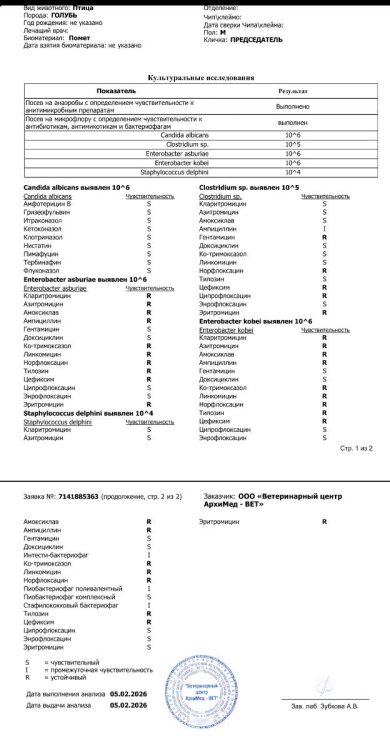 15v0068 (комплекс + мико) arhimed написали помет но это они ошиблись, надеюсь не ошиблись в остальном, хотя да похоже что не ошиблись micoplasma spp пцр шанс био по анализам вижу что текущее лечение в целом правильное, но жизненно важно подключить докси все микроорганизмы к нему чувствительны. дозировка докси в принципе у меня есть. но естественно не откажусь от доп. информации то есть - вижу, что и нистатин и флуконазол весьма кстати. необходимо ли повышать дозировки? сейчас дается треть таблы нистатина 2р в сутки и 0.06-0.07мл из 2мг/мл раствора флука перорально 2р в сутки (то есть 0.13мг 2р в сутки) гепатовет актив дается примерно 0.1-0.15 2р в сутки вес 130++ уже несколько дней (зоб до 150 забивается, но ему проще когда до 140-145 помоему) также в пищу добавляется раствор панкреатина и снежок бифидумбактерина объем из рекомендаций. и надо ли подключать докси прям сию минуту или лучше подождать пару дней пока кандиды станет поменьше? маленький принц: киль показывает истощение но не крайнее друзья скажите свои рекомендации пожалуйста. Председатель очень расчитывает на вашу поддержку) так да каждый свое пишет. но я вот только 3 дня назад понял что зоб это штука которая растягивается. никто почему-то не обратил мое внимание) я же собач а не птич. поэтому попытался забить в него побольше и в принципе оно пошло. но я остановился на объеме не более 10-15 за раз т.к. возможно у него зоб сейчас воспаленный. попробовал отварить пшенки хорошенько разварить - тоже показалось не очень ему. увеличивал концентрацию пшенки - ухудшался помет. ну тяжело ему сейчас наверное просто от плотных каш у него вон че там в жкт творится. пир на весь мир. что вы так гречку все не любите? она ж помоему как раз при кандиде лучше для него будет чем другая каша? и переваривалось намного дольше как мне показалось. буду еще пытаться,