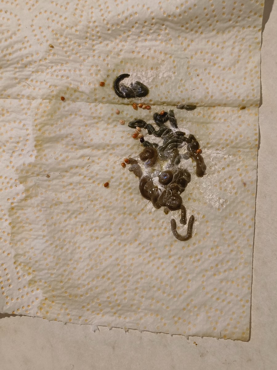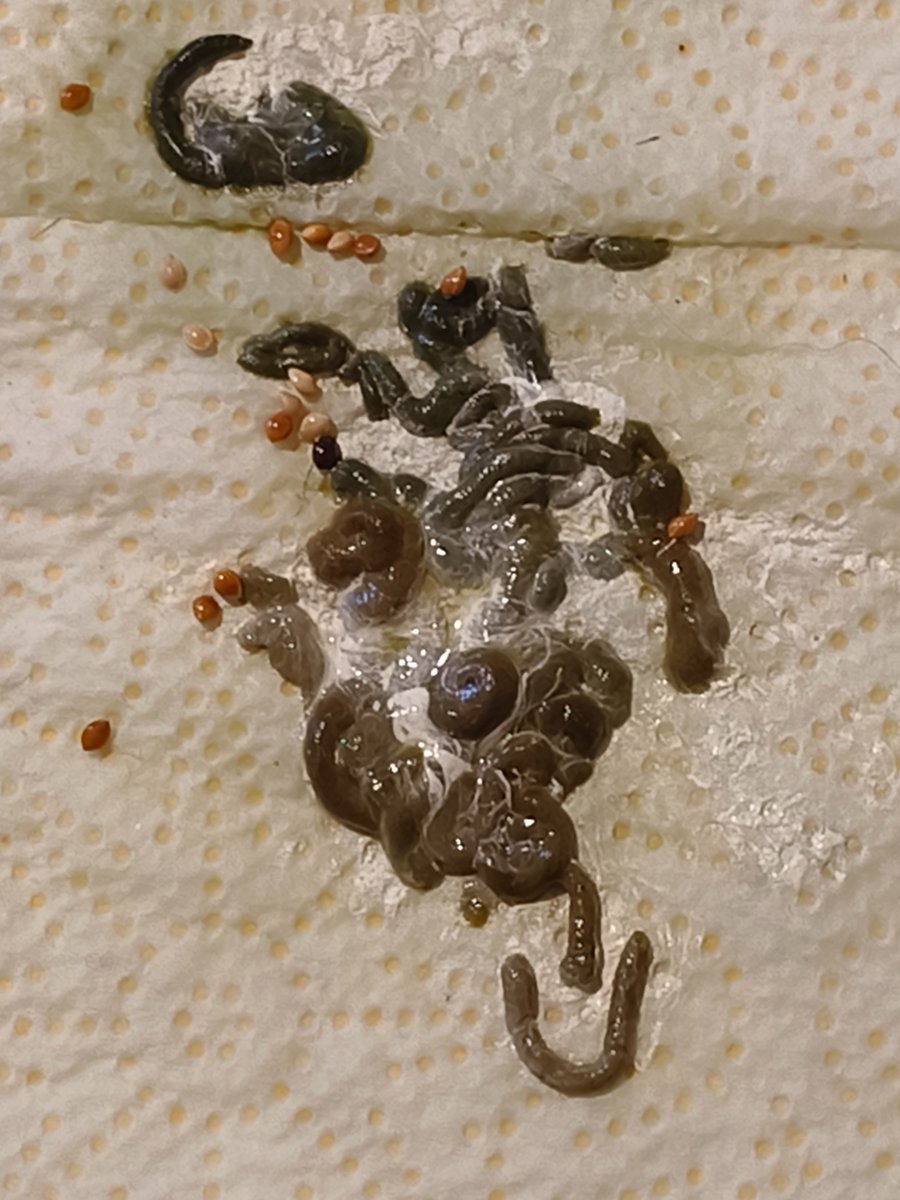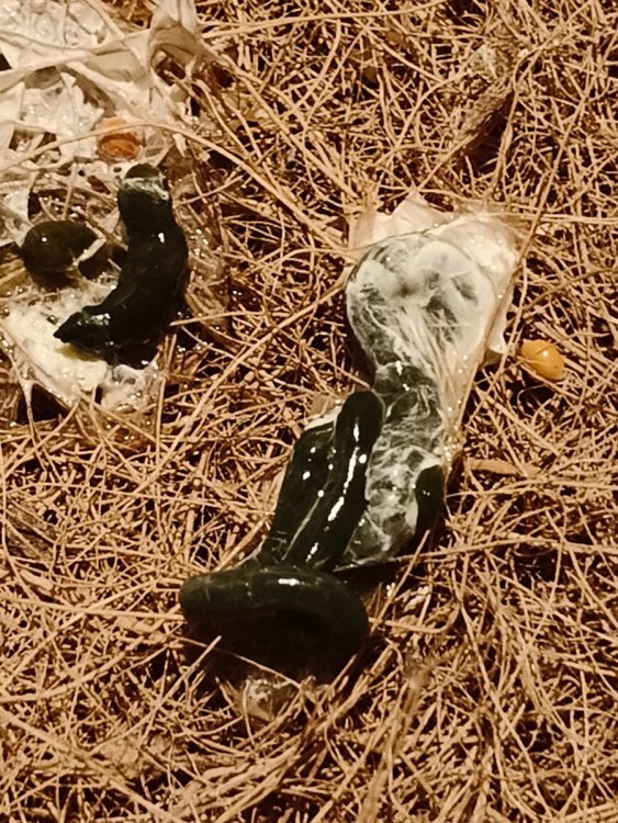 По еде - из магазина для людей - перловка, горох, пшеница (на кутю). Кукуруза с рынка. Тело нормальное вроде, кровоподтеков не обнаружила. На последнем фото он укакался, цвет может казаться коричневым из-за вспышки, но он темно-зеленый. Коричневой там с натяжкой можно было назвать одну полосочку поперечную. На фото обвела.