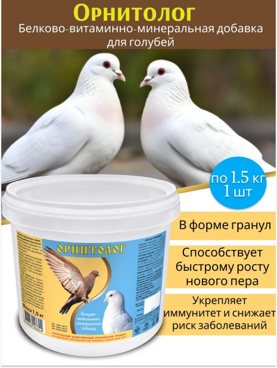 БВМД «Орнитолог» — это сбалансированная белково-витаминно-минеральная добавка в форме гранул, разработанная специально для голубей. Она укрепляет иммунитет, улучшает обмен веществ, повышает плодовитость, а также обеспечивает рост пера в период линьки, содержа витамины (A, D3, E, K3, группа B), кальций и фосфор. Город Животных +2 Ключевые характеристики добавки «Орнитолог»: Состав: Комплекс витаминов (A, D3, E, K3, B1, B2, B3, B4, B5, B6, Bc, B12, C, H), макро- и микроэлементы (кальций, фосфор), белки и углеводы. Применение: Добавку обычно дают в объеме 10% от основного суточного рациона корма. Польза: Укрепляет иммунитет и повышает устойчивость к стрессам. Улучшает развитие птенцов и повышает плодовитость. Способствует быстрому росту пера во время линьки. Нормализует обмен веществ и улучшает усвояемость корма. Вид: Гранулы, хорошо поедаются птицами. Город Животных +3 Добавка полезна для поддержания общей активности и здоровья голубей, особенно в критические периоды (линька, размножение)