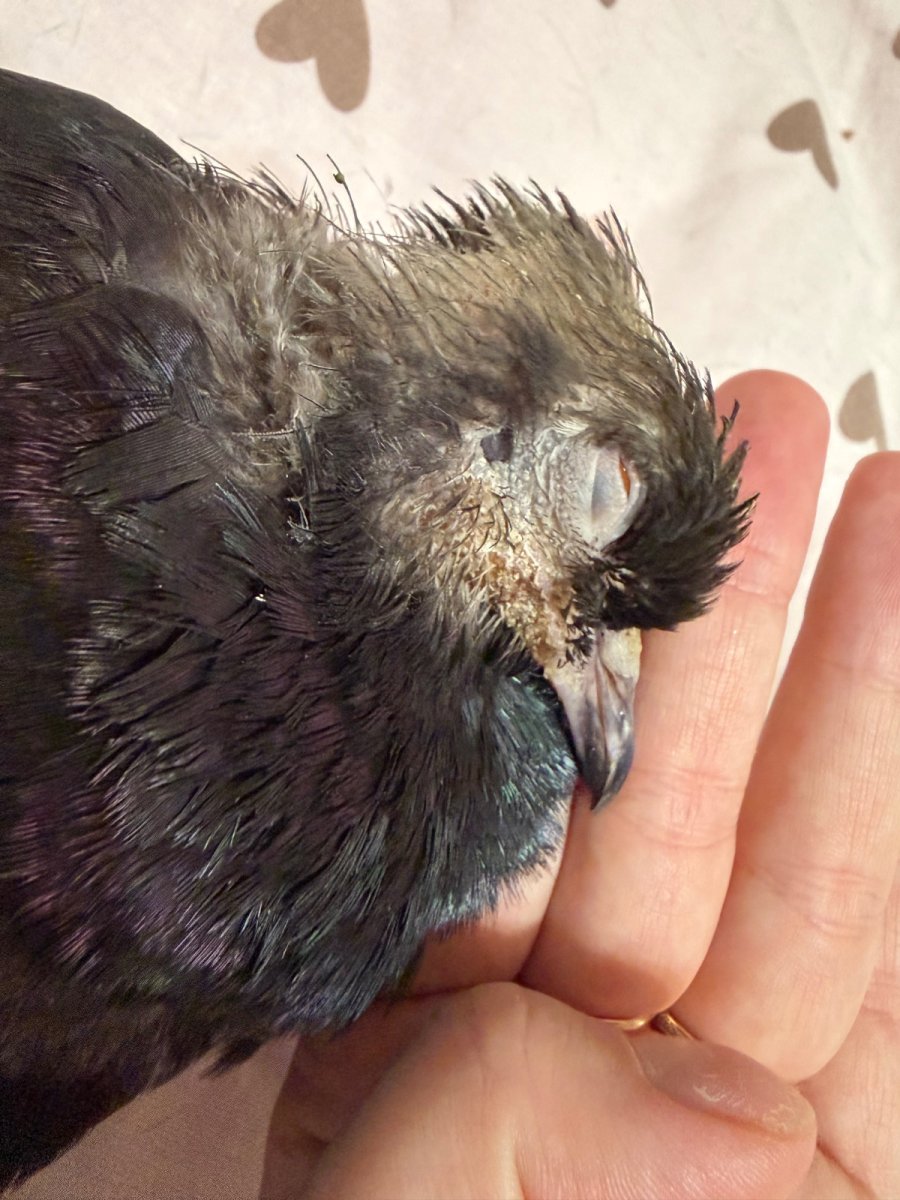 Все здравствуйте! Вчера утром нашла на улице голубя, оба глаза были в твердом гною, он ничего не видел, истощен. Есть нарост 1 у клюва. Гной и нарост бежевого цвета. Говно было ярко зеленое, сегодня светло желтое. Промыла глаза, очистила, закапала Omnix. Много выпил воды вчера, но не ел. Давала доксициклин с водой немного. отварила гречки. Сегодня он весь день ничего не пьет, не есть, сидит еле еле, напыжился, хвост и крылья опущены, голова в среднем положении, глаза чистые, но закрытые, бывали хрипы при дыхании, иногда приоткрытый клюв. У меня ни попросить ни самой съездить к ветеринару вчера, сегодня, завтра не получается, тк я работаю помогите советом, пожалуйста Фото не сделала ДО, сейчас он чистый, только нарост остался.