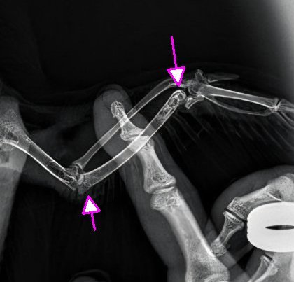 Здравствуйте! Месяц назад подобрали голубя на улице. Он не летал, был вялый и плохо ел. У него опущено правое крыло, и он может расправить только левое, а правое полностью не раскрывает. Сдавали анализы — выявили кокцидиоз, глистную инвазию и кишечную инфекцию. Проводили лечение: ципрофлоксацин, нистатин (позже перешли на флуконазол), Кокцистоп и Празистан. Сейчас голубь активный, хорошо кушает, помёт нормальный. Но он по-прежнему не летает, и правое крыло остаётся опущенным. Сделали рентген (прикрепляю). Подскажите, пожалуйста, видно ли по снимку, в чём может быть причина, и есть ли шанс восстановить крыло, чтобы голубь смог летать?
