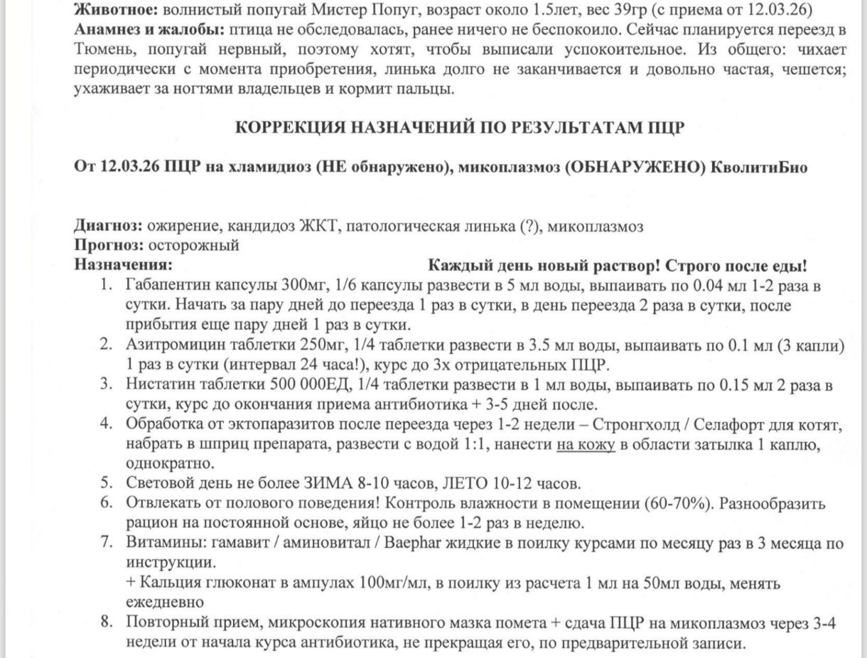 Доброго времени суток! У меня волнистый попугай мальчик около 1,3 года возраст. 2 недели назад были у орнитолога с жалобами на частое чихание и чесание у попугая, на основе анализов (ПЦР и анализ кала) поставили диагнозы микопласмоз и кандидоз ЖКТ. Выписали нистатин и Азитромицин. Сейчас спустя 2 недели лечения чихание не прошло, чесание тоже, при этом он ещё начал часто чесать клюв и рядом с клювом об поверхности и как-будто иногда открывать рот как-будто для отрыгивания. Подскажите пожалуйста, продолжать ли текущее лечение или не ждать конца срока поставленного лечения и сейчас снова ехать к орнитологу? В целом птиц очень активный, ест пьет хорошо, кал без аномалий. Просто переживаю что лечение не подошло и как бы хуже не стало....
