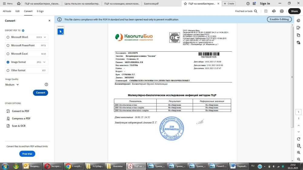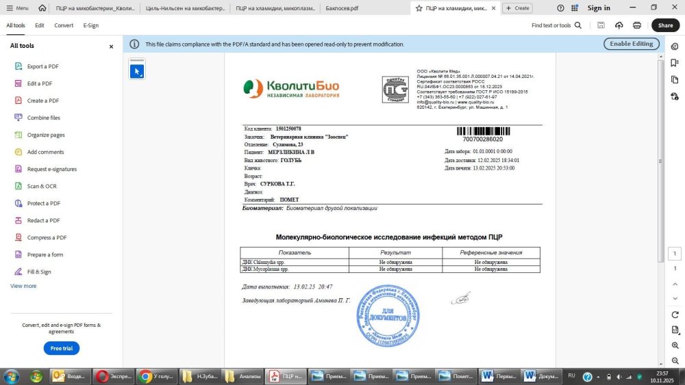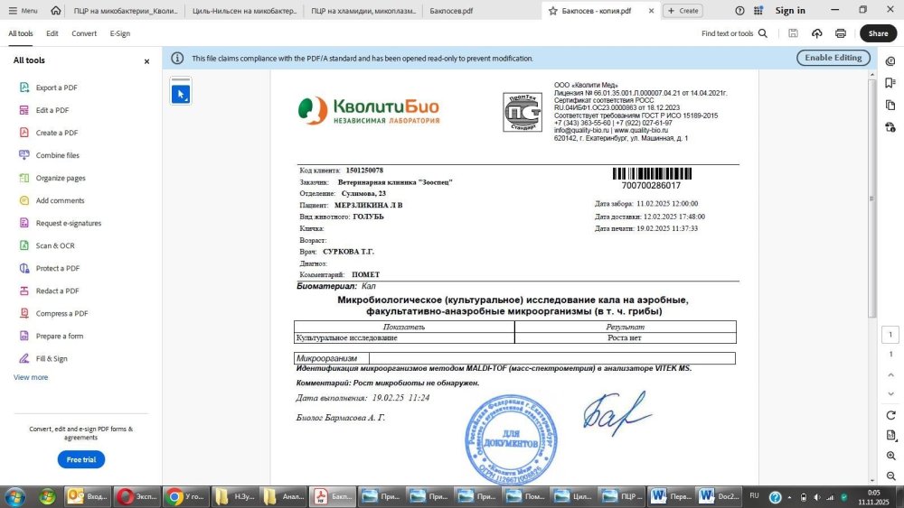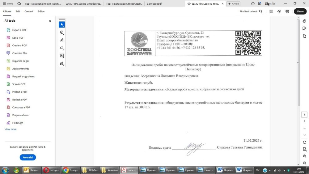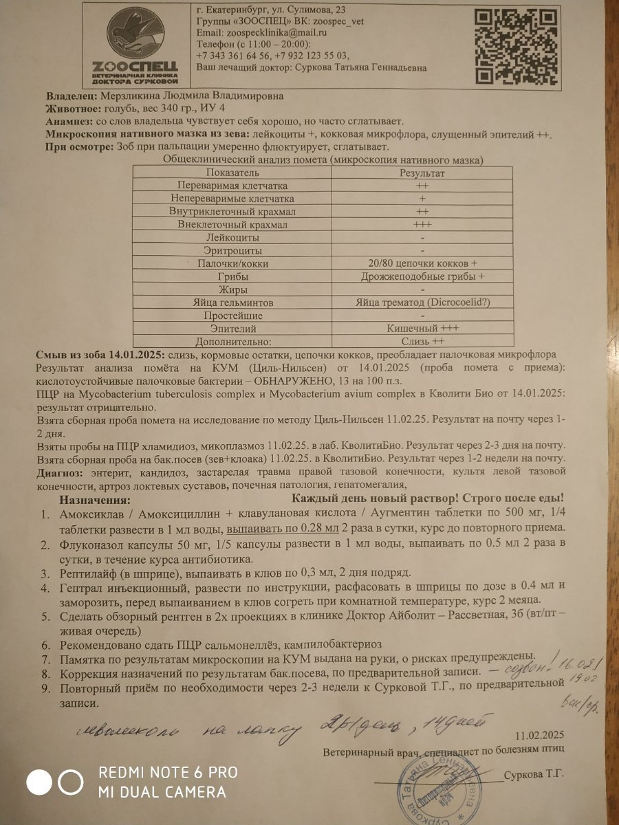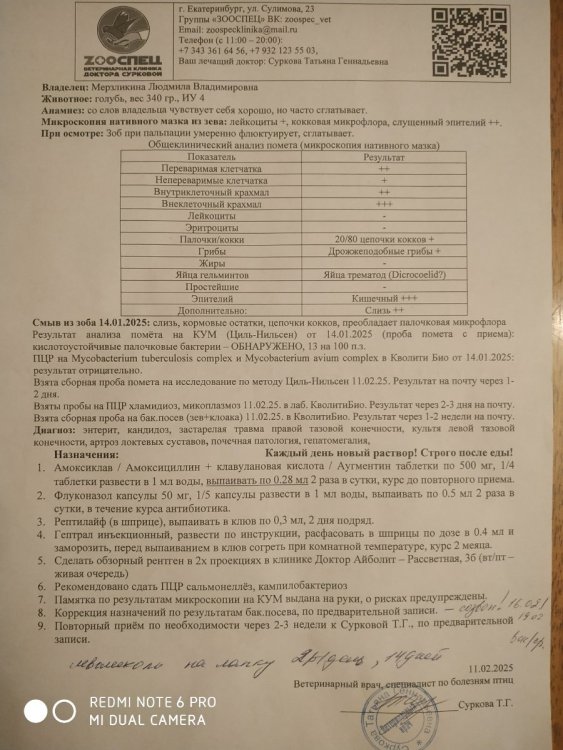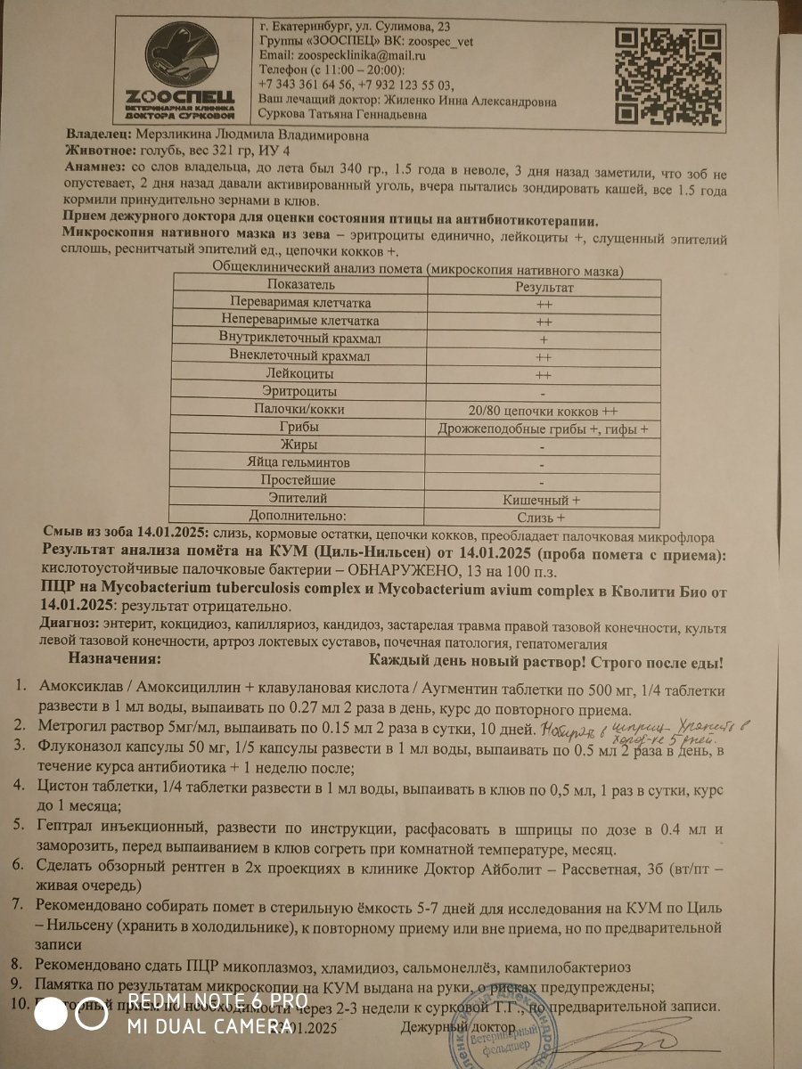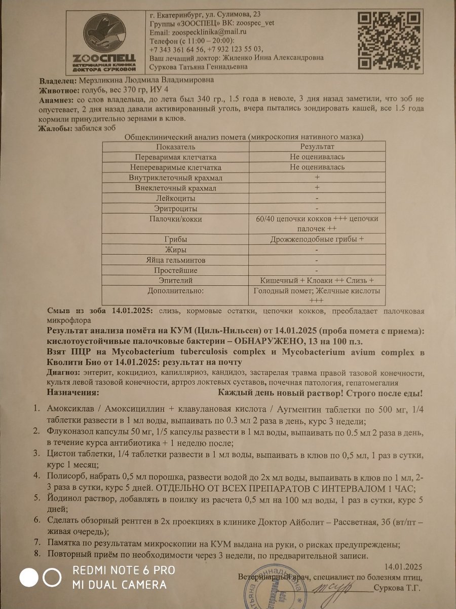 Первый прием был 14 января (это когда зоб встал пару дней назад). Тогда был взят анализ помета на КУМ (Циль-Нильсен) и обнаружены кислотоустойчивые палочковые бактерии 13 на 100 п.з. и анализ помета на Mycobacterium avium, Mycobacterium avium complex, Mycobacterium tuberculosis complex – результат отрицательно. Второй прием 23 января и третий в феврале, когда были сданы сборная проба помета на исследование методом Циль-Нильсен, проба на ПЦР хламидиоз и микоплазмоз и сборная проба (зев+клоака) на бак.посев (файлы приемов и анализов прикрепила).